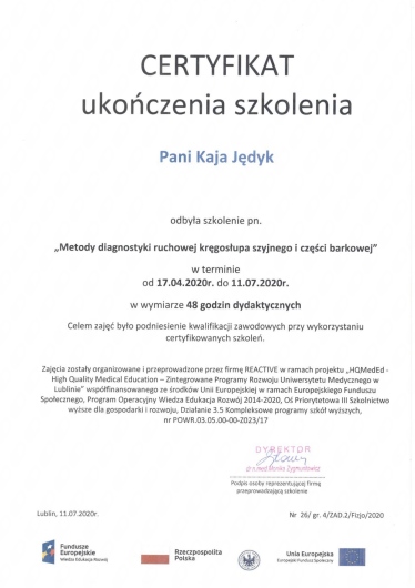 Jestem absolwentką Uniwersytetu Medycznego w Lublinie. W swojej pracy wykorzystuję techniki terapii tkanek miękkich, masażu tkanek głębokich oraz terapii na punktach spustowych. Z pacjentami pracuję także treningiem medycznym. Stawiam na dokładną diagnostykę oraz dobór terapii dostosowanej do potrzeb i celów każdej osoby. Pomagam zrozumieć przyczyny dolegliwości i uczę jak poprzez odpowiednie nawyki dbać o swoje zdrowie na co dzień.