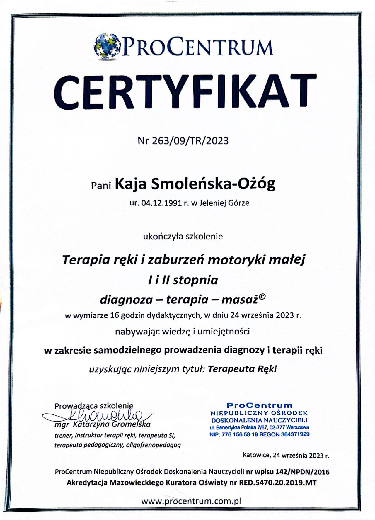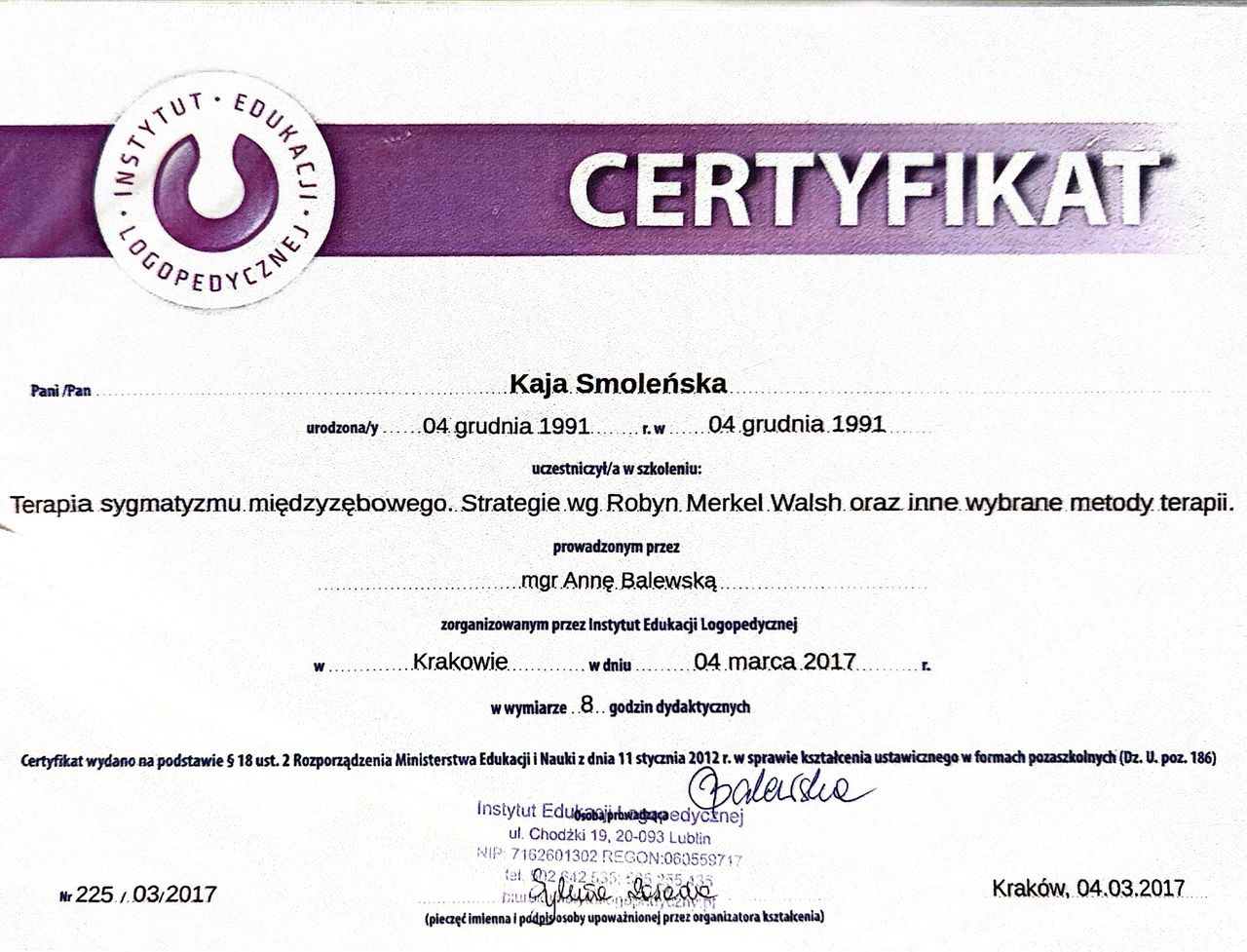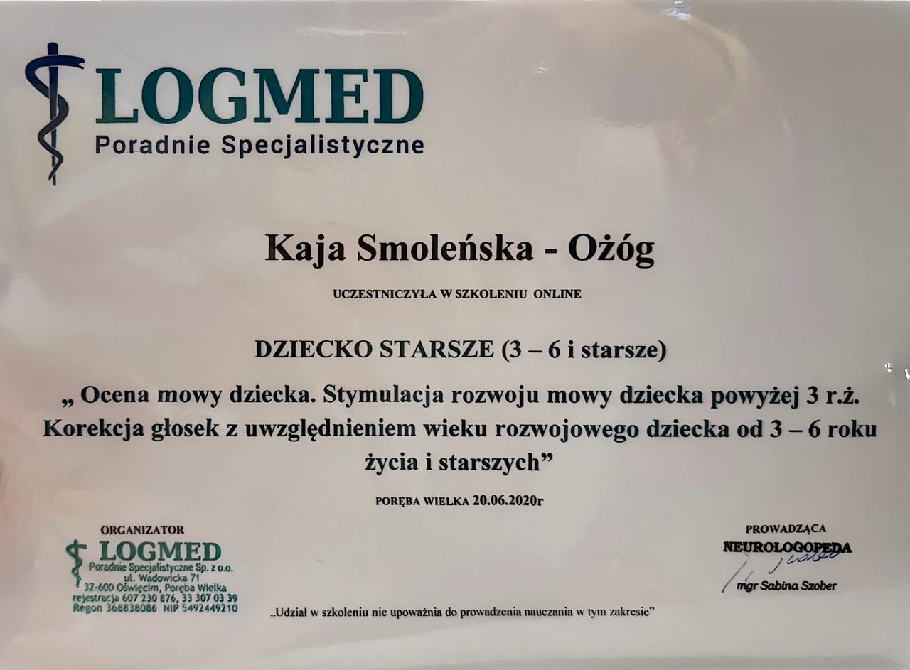 Pani Kaja była trzecim logopedą, do którego trafiłam z moim synem. Obrała zupełnie inny plan prowadzenia terapii logopedycznej, całkiem odmienny od dwóch proponowanych wcześniej. Jedyny, który przyniósł u nas realne efekty. Syn został wyprowadzony ze wszystkich wad wymowy, z jakimi przyszedł do gabinetu. Nigdy nie przestanę być wdzięczna Pani Kai i nigdy nie przestanę jej polecać innym rodzicom. Ogromna cierpliwość, wyrozumiałość, wizyty sympatyczne, ale i bardzo konkretne. Syn nie był prostym przypadkiem-duża nadruchliwość, częsty brak chęci do ćwiczeń i współpracy. Pani Kaja w gabinecie stawała na rzęsach, żeby to szło do przodu. Dzisiaj syn ma przepiękną wymowę (potwierdzoną uroczystym odbiorem dyplomu mistrza mowy, który otrzymał na ostatnich zajęciach - trzyma go do dziś :) )