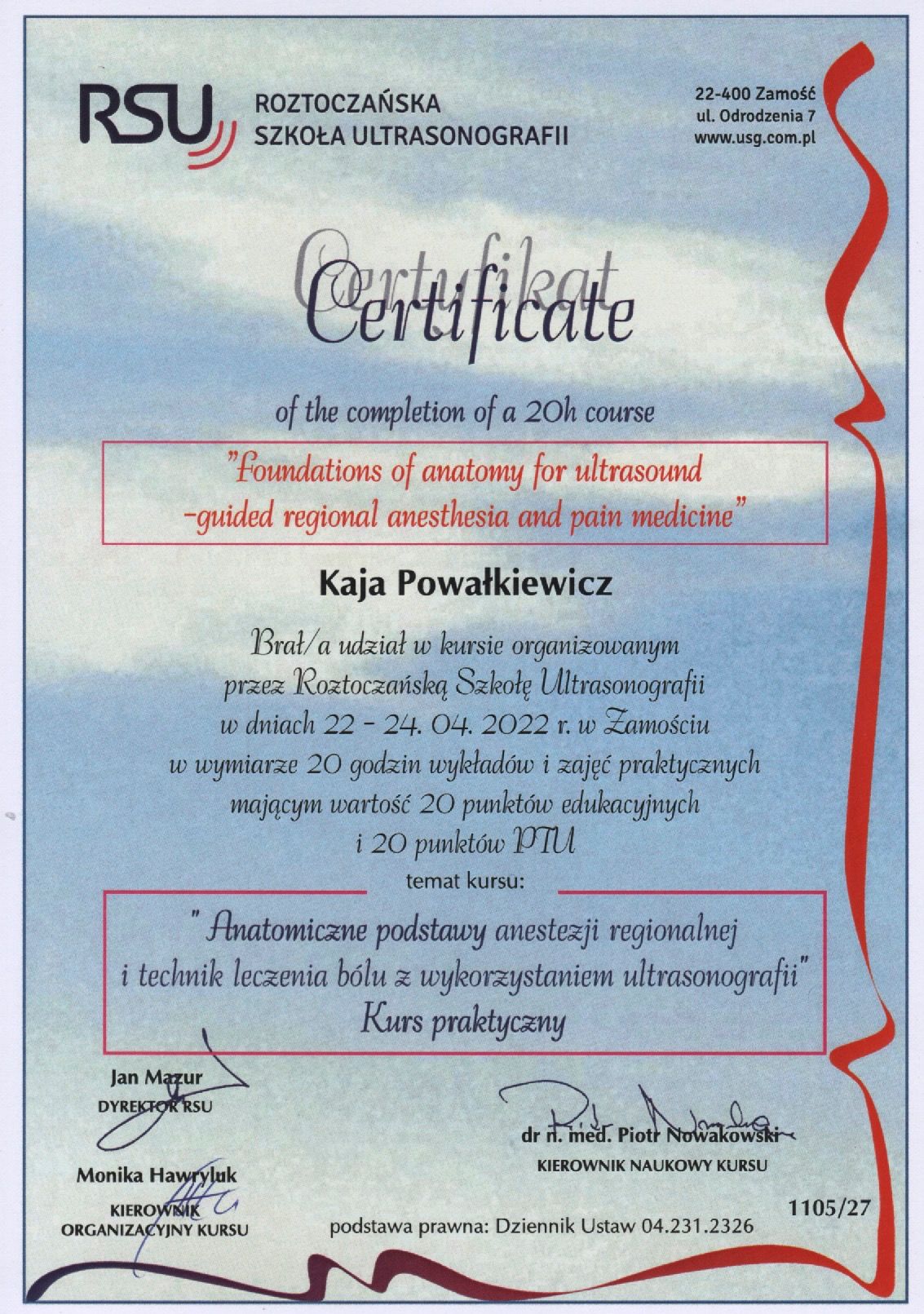 W swojej pracy w gabinecie wykorzystuje umiejętności zdobywane podczas pracy z pacjentem na bloku operacyjnym czy Oddziale intensywnej Terapii, precyzyjne podawanie leków, często dla bezpieczeństwa z wykorzystaniem ultrasonografii stanowi nieodłączny element kazdej inwazyjnej procedury medycznej.