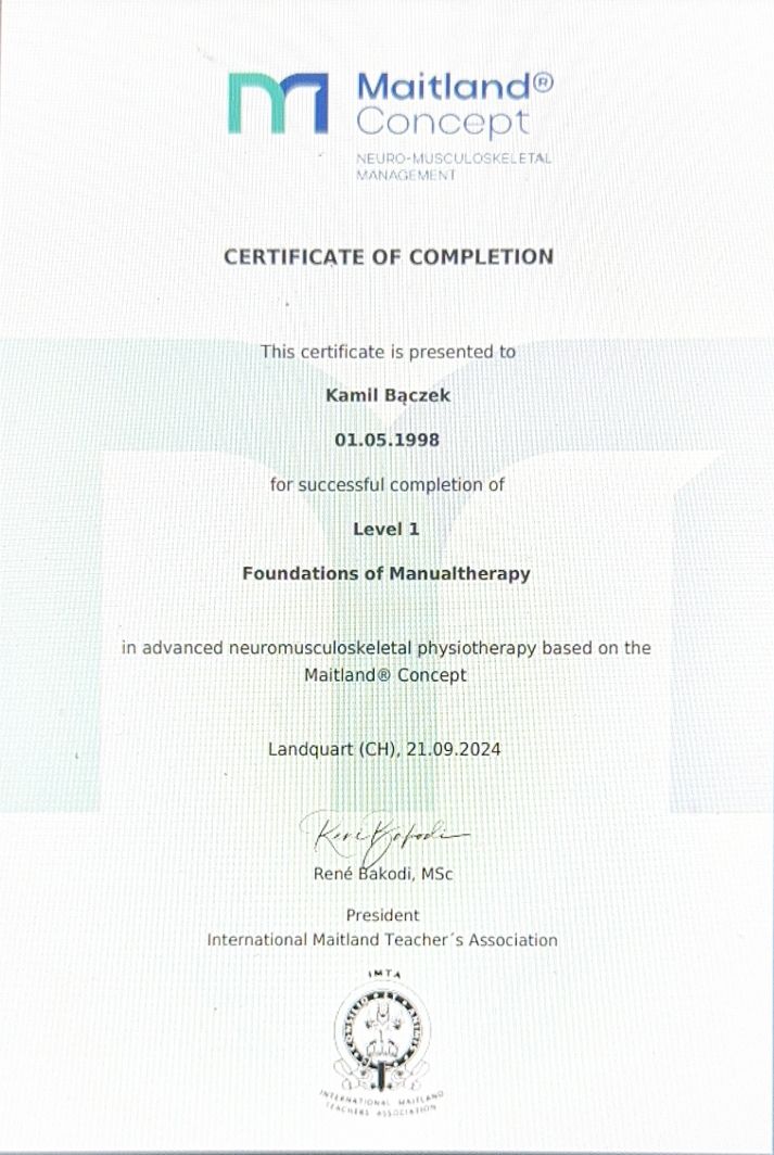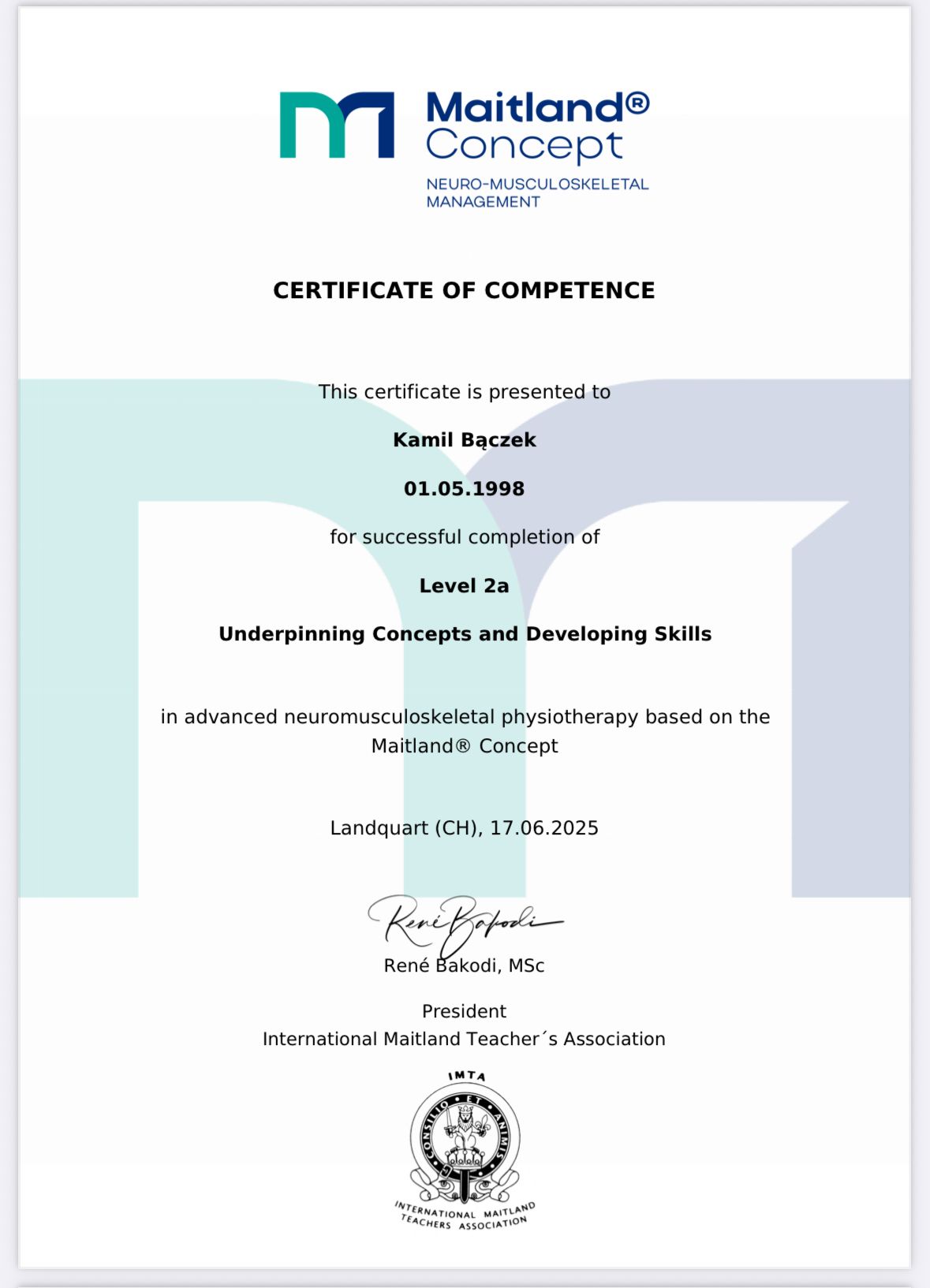Ponadto ukończyłem specjalistyczne szkolenia, pozwalające na efektywną pracę z osobami zmagającymi się z problemami narządu ruchu. Jestem m.in dyplomowanym terapeutą manualnym koncepcji Maitland a także ukończyłem szkolenie z zakresu treningu z odważnikami kettlebell oraz szkolenie z powrotu do sportu po rekonstrukcji więzadła krzyżowego przedniego.