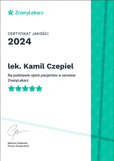 Jak Kamil Czepiel umawia wizyty?Kamil Czepiel używa kalendarza ZnanyLekarz, dlatego na stronie widzisz aktualne terminy. Wystarczy, że wybierzesz datę i godzinę, które odpowiadają Ci najbardziej. Umawianie wizyty jest darmowe, a tuż przed terminem wyślemy Ci przypomnienie.