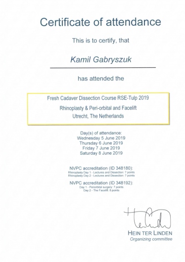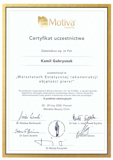 Dyplomowany lekarz medycyny estetycznej, którą zajmuję się od początku swojej pracy jako lekarz. Regularnie uczestniczy w stażach, kursach i kongresach z zakresu chirurgii plastycznej oraz medycyny estetycznej organizowanych zarówno w kraju jak i za granicą min. w Sztokholmie, Wiedniu czy Holandii.