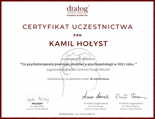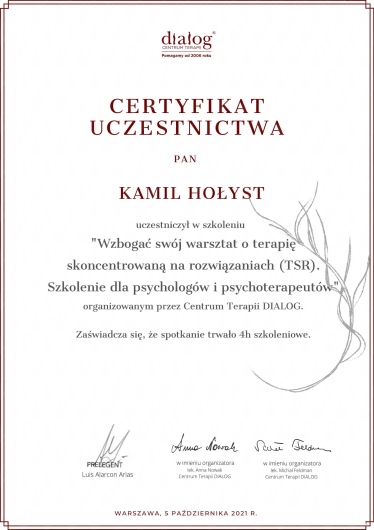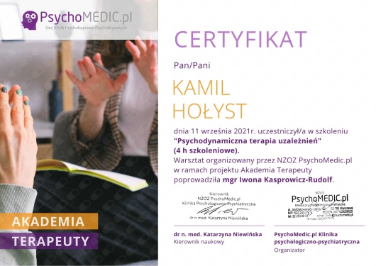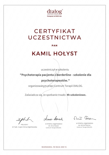 Jestem członkiem Polskiego Towarzystwa Psychoterapii Psychodynamicznej, certyfikowanym trenerem umiejętności społecznych (TUS) oraz certyfikowanym trenerem kontroli złości dzieci i młodzieży.