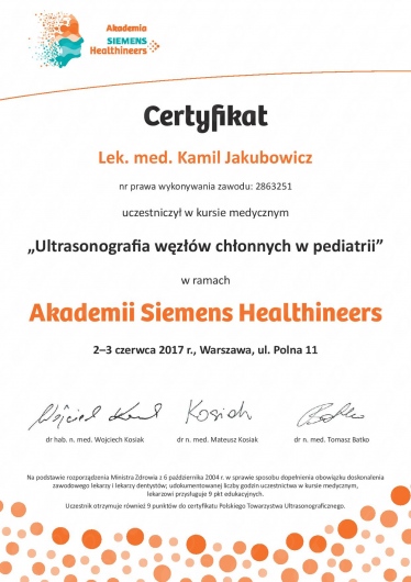 Jaki jest zakres porad oferowanych przez Kamil Jakubowicz?Kamil Jakubowicz to chirurg onkologiczny. Na podstawie swojego doświadczenia i wykształcenia Kamil Jakubowicz oferuje usługi takie jak: biopsja węzłów chłonnych, konsultacja chirurga onkologa, biopsja ślinianki, USG jamy brzusznej, biopsja gruboigłowa piersi, biopsja cienkoigłowa tkanek miękkich, USG szyi, USG piersi + tarczycy + jamy brzusznej, USG tarczycy, USG piersi.