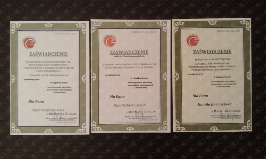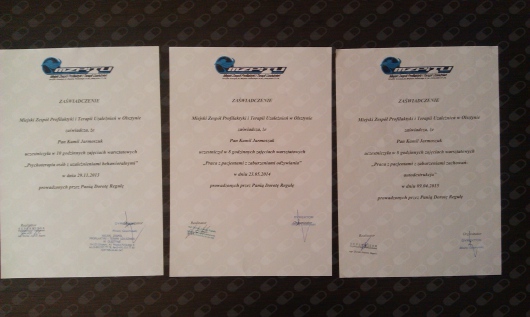 Ukończyłem zaawansowany poziom obejmujący treści czterech podspecjalności psychologii klinicznej: zaburzenia psychiczne człowieka dorosłego, psychologia kliniczna chorego somatycznie, psychologia kliniczna dzieci i młodzieży oraz neuropsychologia ze szczególnym uwzględnieniem zaburzeń psychicznych człowieka dorosłego.