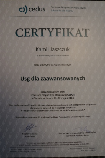 Ciągle podnoszący swoje kwalifikacje, uczestniczący w konferencjach, warsztatach i szkoleniach z zakresu EUS, gastroskopii, kolonoskopii.