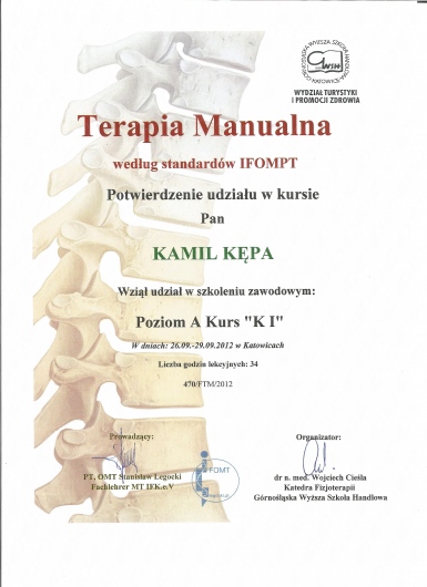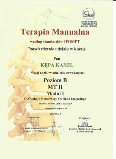 (Egzamin: Teoretyczny i Praktyczny). Tytuł: Certyfikowany Terapeuta Manualny MT I.
