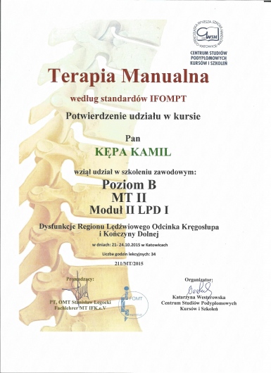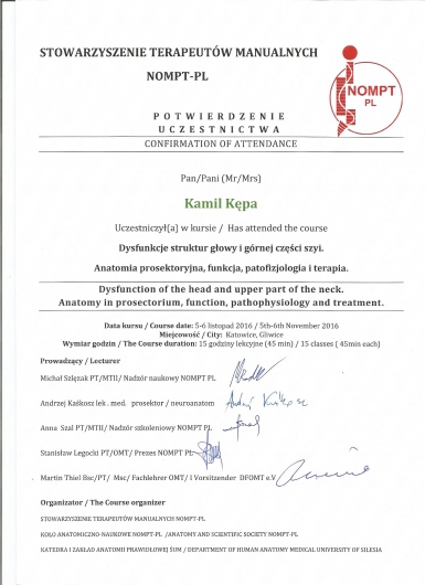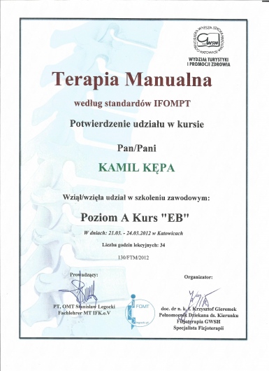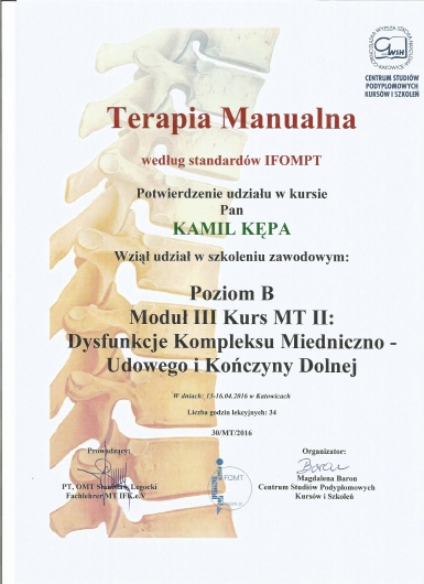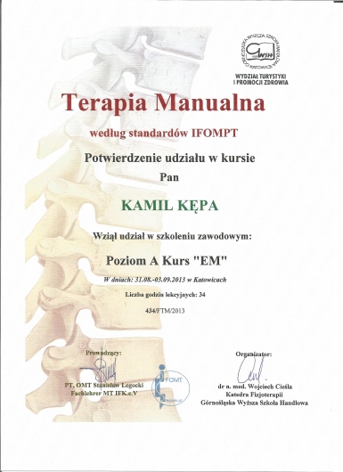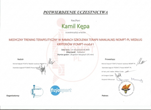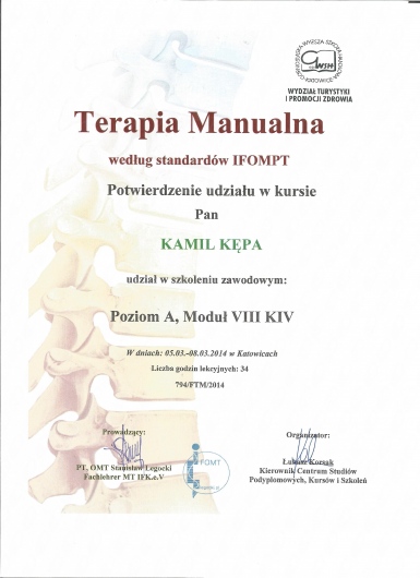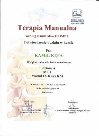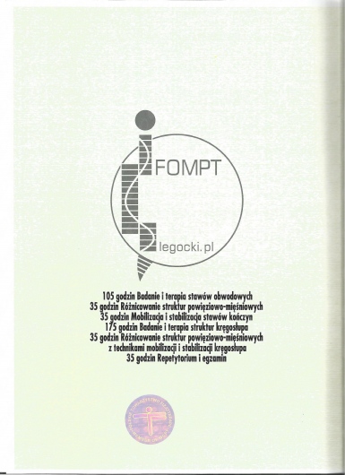 - Egzamin zdany w obecności obserwatora z ramienia IFOMPT: Martin Thiel PT, OMT, Instructor MT IFK.e.V, DFOMT.