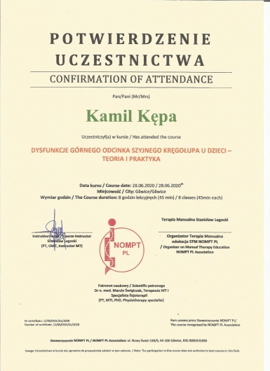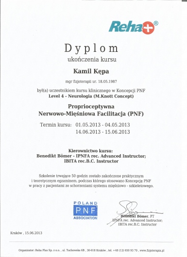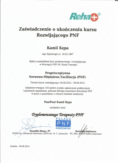2012 Kurs PNF (M. Knott Concept) level 3 (PNF Advanced), zakończony egzaminem – uzyskany tytuł: Dyplomowany terapeuta PNF.