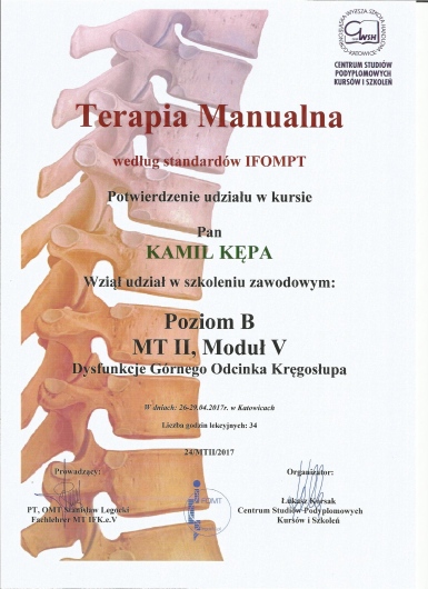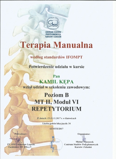 (Prowadzący: Terapeuta Manualny MT II mgr Michał Szlęzak, Instruktor MT e.V. IFK PT/OMT Stanisław Legocki, prof. nadzw. dr hab. Miłosz Czuba, dr Grzegorz Zydek, mgr Wojciech Mroszczyk.)