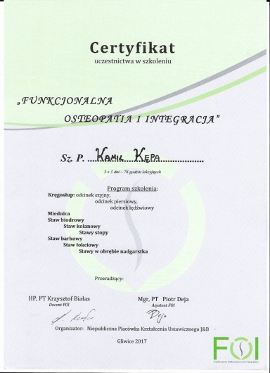 Pracuję z pacjentami ortopedycznymi, po urazach, zabiegach operacyjnych, a także z szeroką grupą sportowców. Edukuję pacjentów w zakresie własnej pracy pozagabinetowej oraz zaznaczam jak ważne jest stabilizowanie efektów wizyty fizjoterapeutycznej. Jeśli chcesz wrócić do swojej dotychczasowej aktywności fizycznej, rozpocząć ją w sposób bezpieczny lub po prostu korzystać z życia bez powracającego bólu to zapraszam do kontaktu