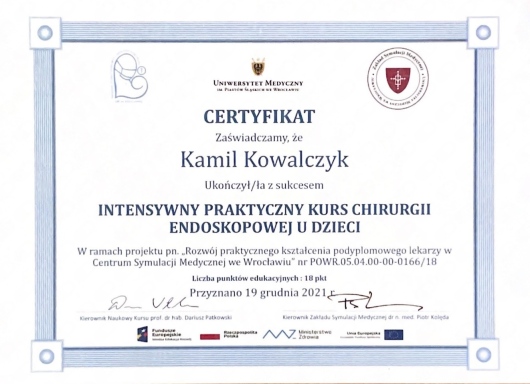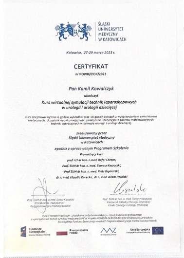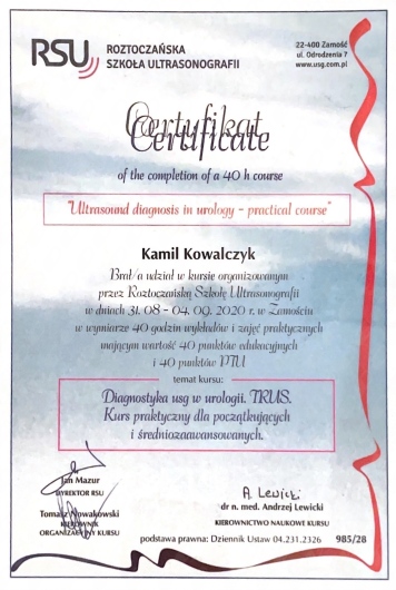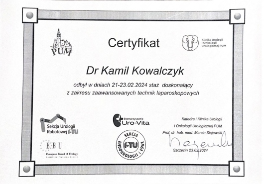 Jestem członkiem Polskiego Towarzystwa Urologicznego (PTU), Sekcji Adeptów Urologii oraz Europejskiego Towarzystwa Urologicznego (EAU). Swoje kwalifikacje podnoszę biorąc udział w kursach i szkoleniach z zakresu chirurgii laparoskopowej czy diagnostyki ultrasonograficznej.