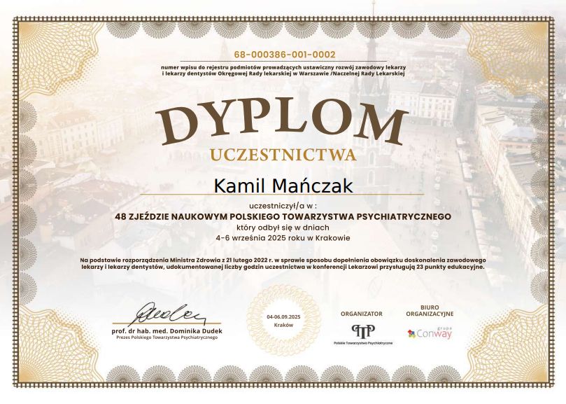 Czy Kamil Mańczak przyjmuje online, bez konieczności pojawiania się w placówce?Nie, w tym momencie Kamil Mańczak nie oferuje konsultacji online.