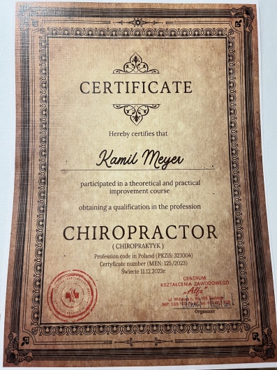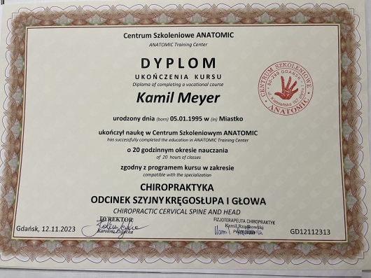 Jaki jest zakres porad oferowanych przez Kamil Meyer?Kamil Meyer to fizjoterapeuta. Na podstawie swojego doświadczenia i wykształcenia Kamil Meyer oferuje usługi takie jak: chiropraktyka, konsultacja fizjoterapeutyczna, Terapia manualna, ESWT: fala uderzeniowa stosowana w leczeniu choroby Peyroniego, zaburzeń erekcji i przewlekłych zapaleniach stercza i zespołów bólowych miednicy mniejszej, fizjoterapia stomatologiczna.