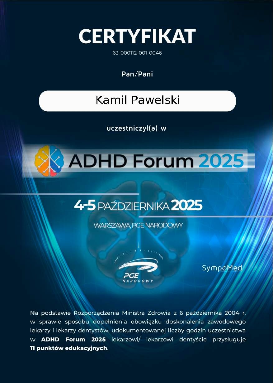 Bardzo polecam! Pan Pawelski przeprowadził wnikliwą i profesjonalną diagnozę ADHD u mnie jako osoby dorosłej. Cały proces przebiegł w spokojnej atmosferze, czułem się wysłuchany i zrozumiany. Dzięki temu mam teraz jasność i mogę działać dalej ze świadomością swoich potrzeb.