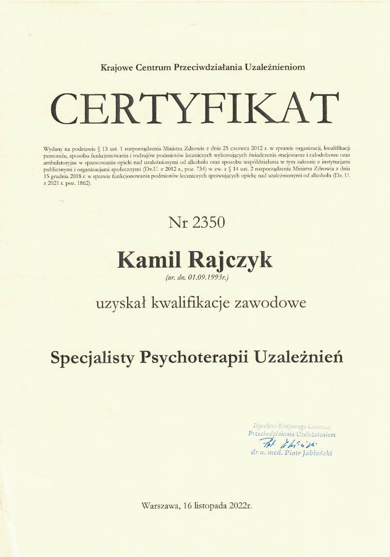 W 2022 roku, po zdaniu egzaminu państwowego i obronie pracy certyfikacyjnej, uzyskałem tytuł Certyfikowanego Specjalisty Terapii Uzależnień (nr 2350).