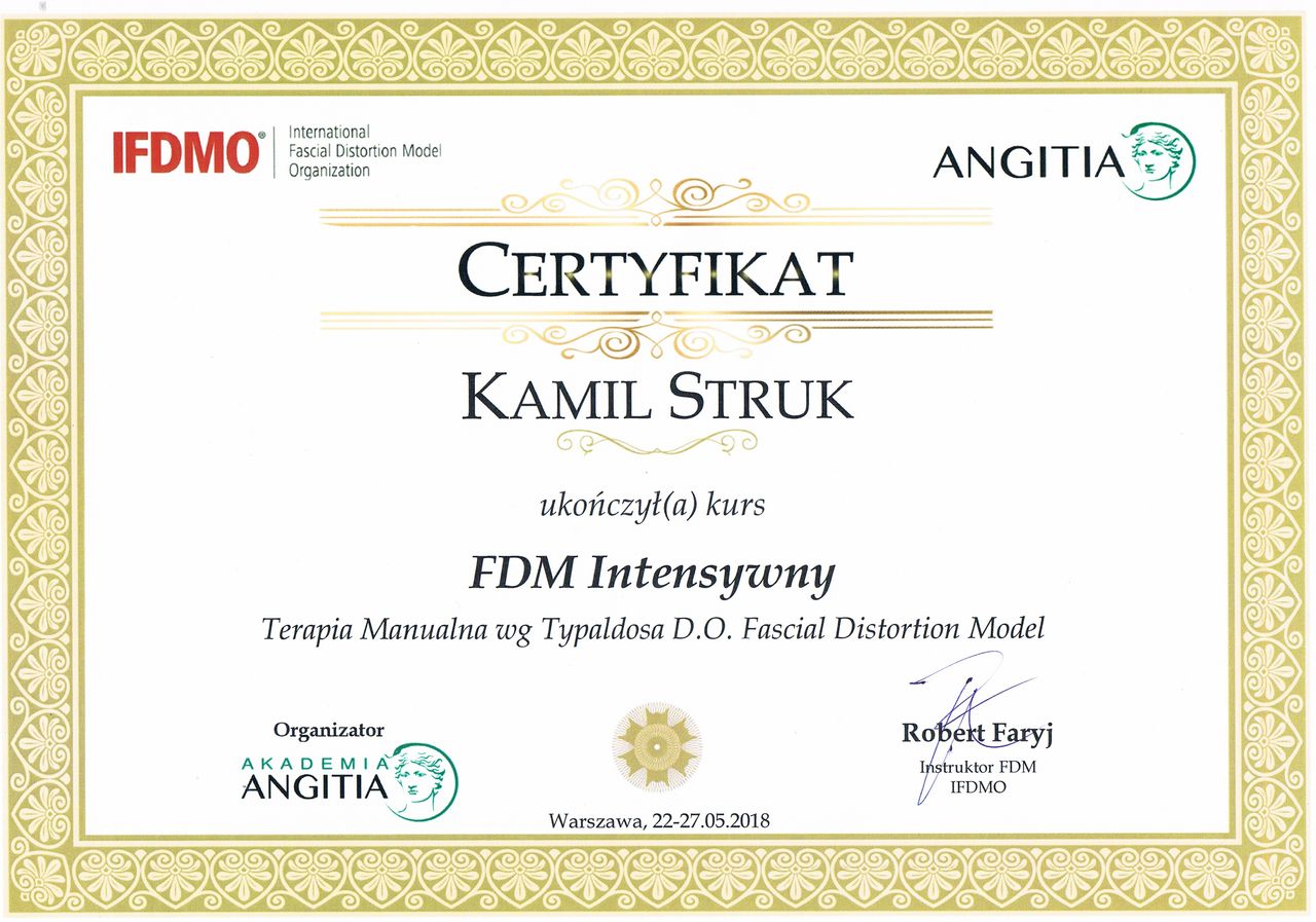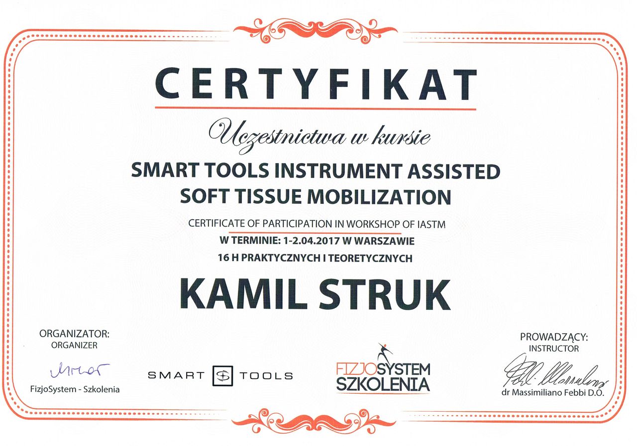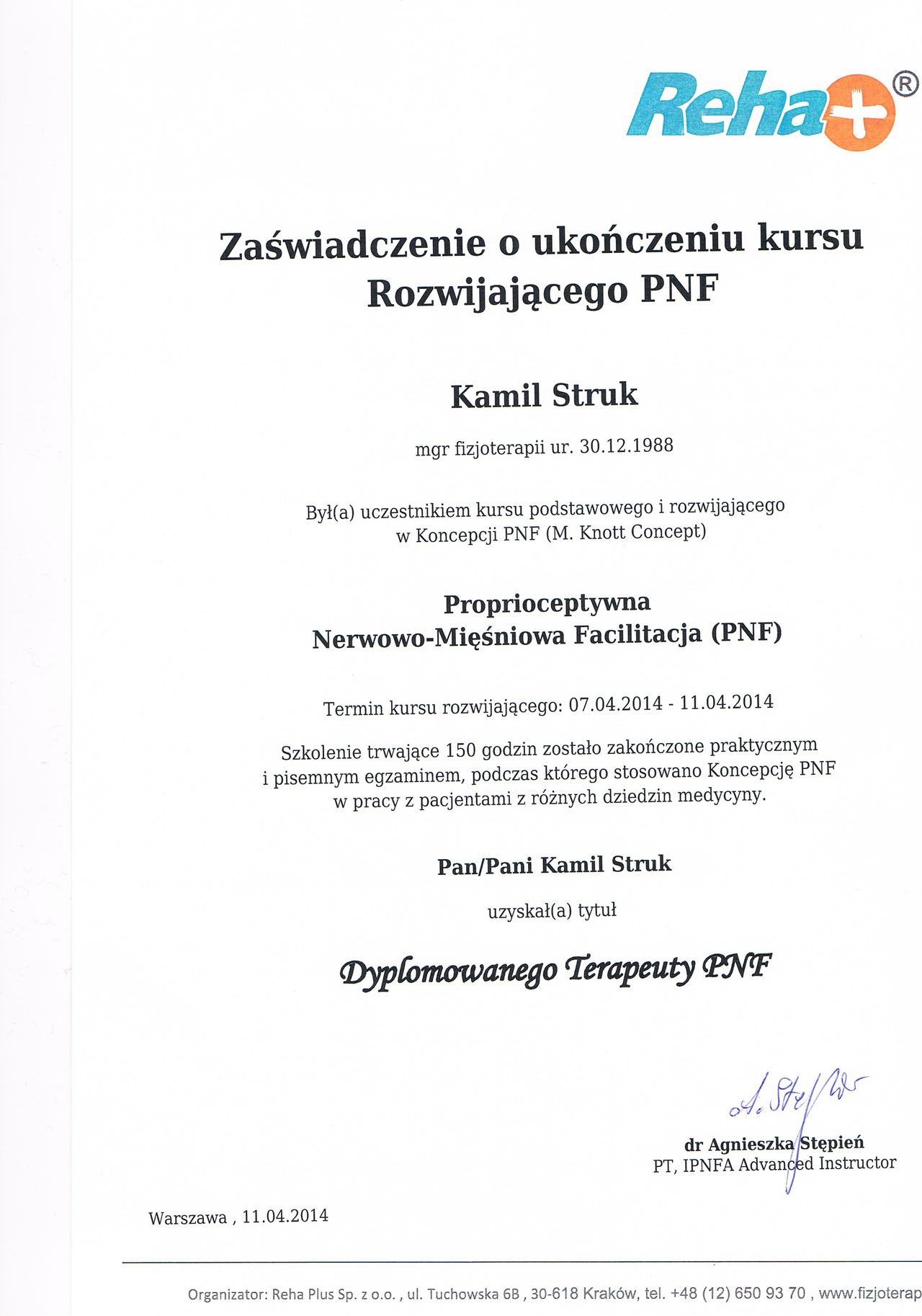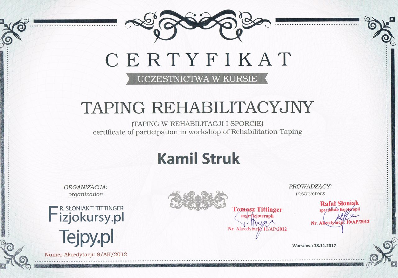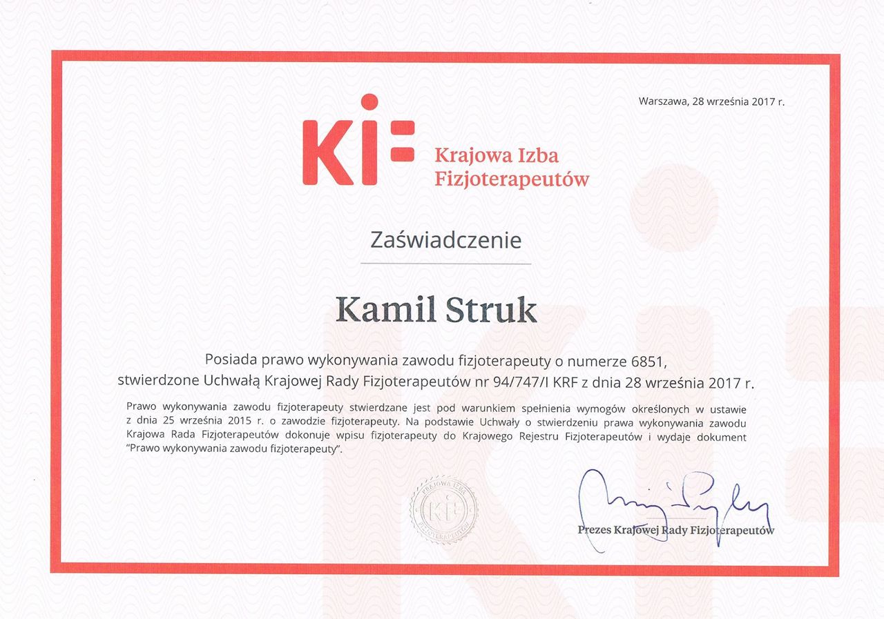 Dyplomowany terapeuta metody PNF (Proprioceptiv Neuromuscular Facilitation).