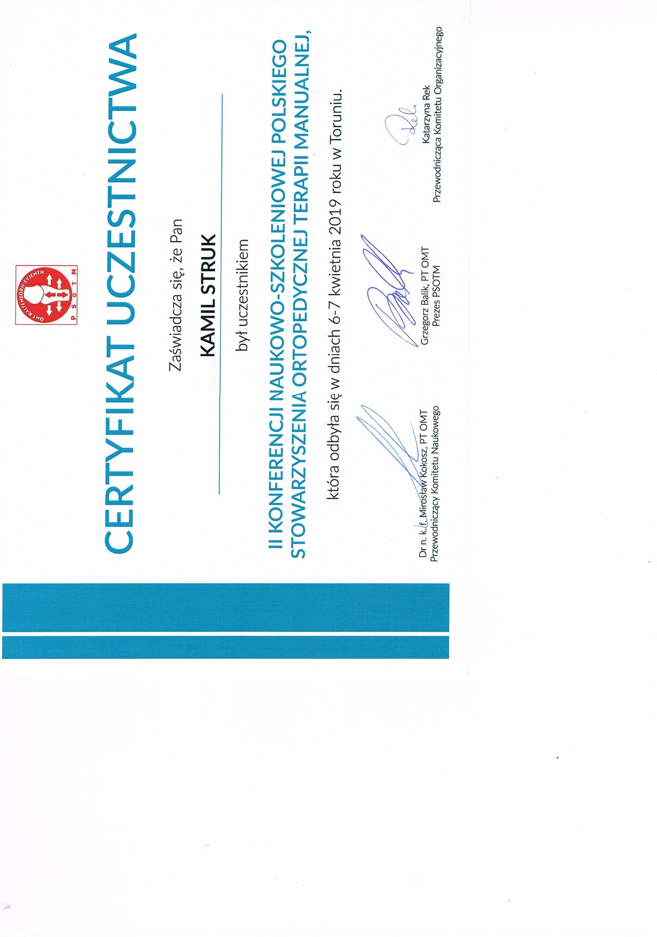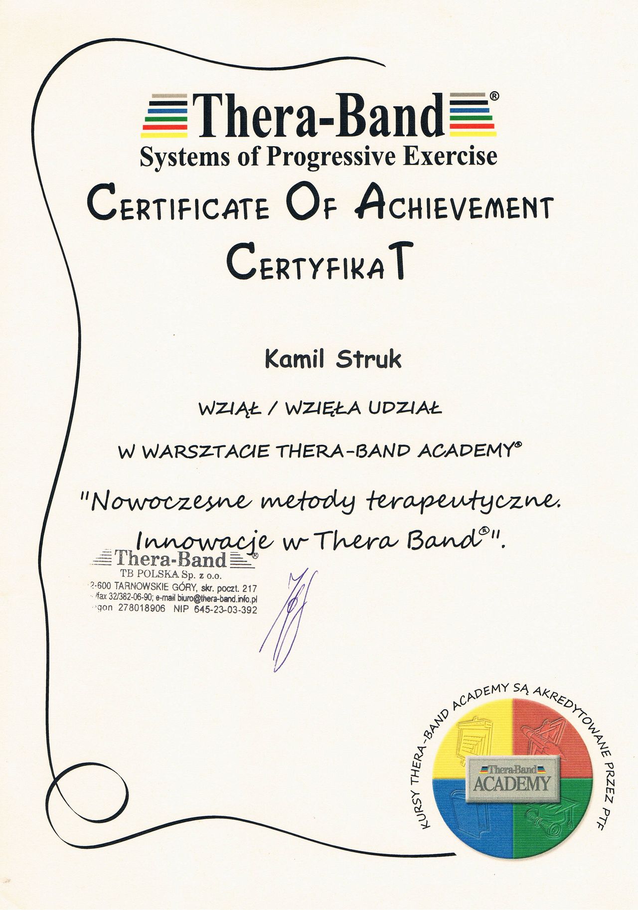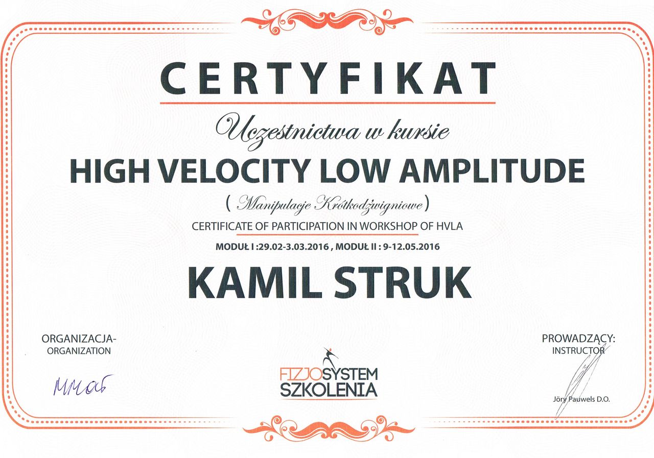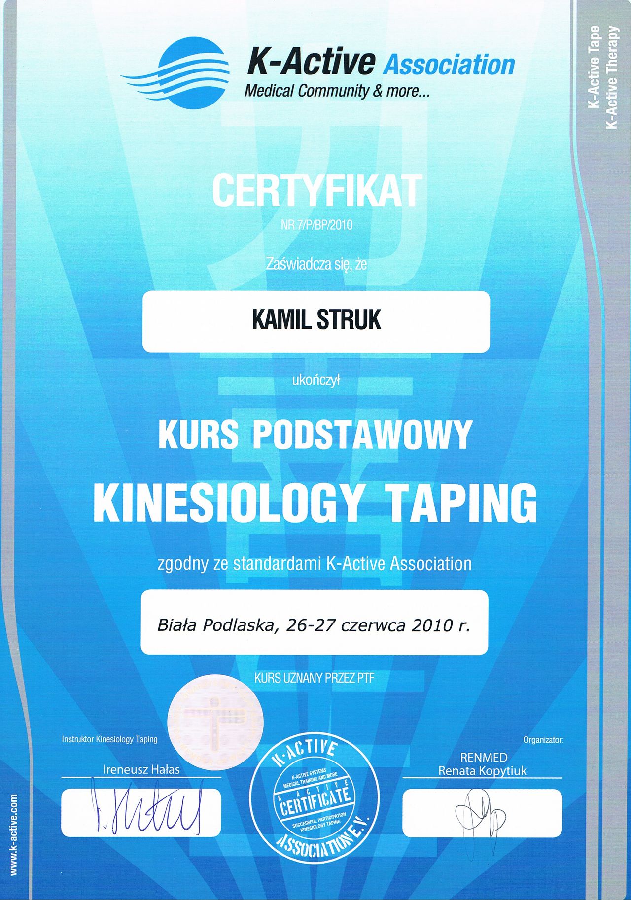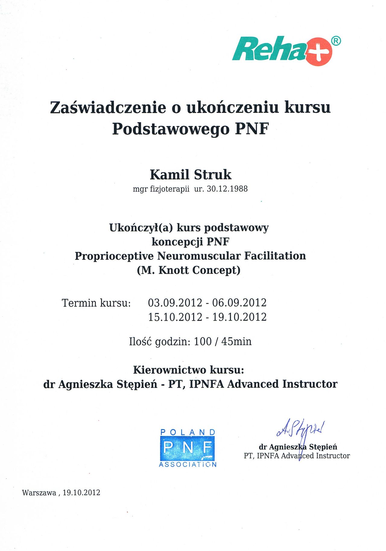 Dyplomowany terapeuta metody PNF (Proprioceptiv Neuromuscular Facilitation).