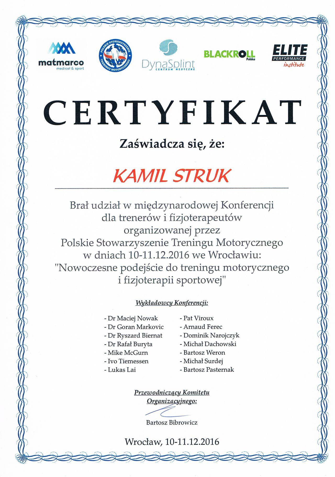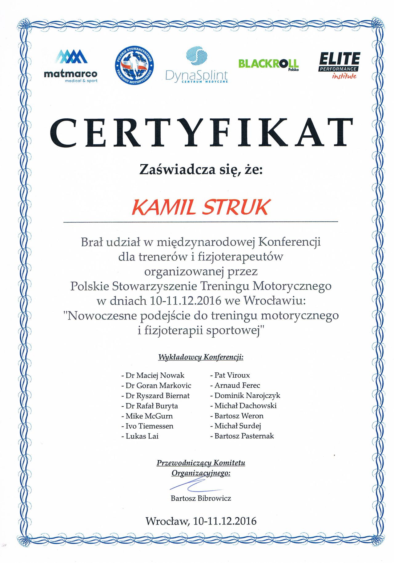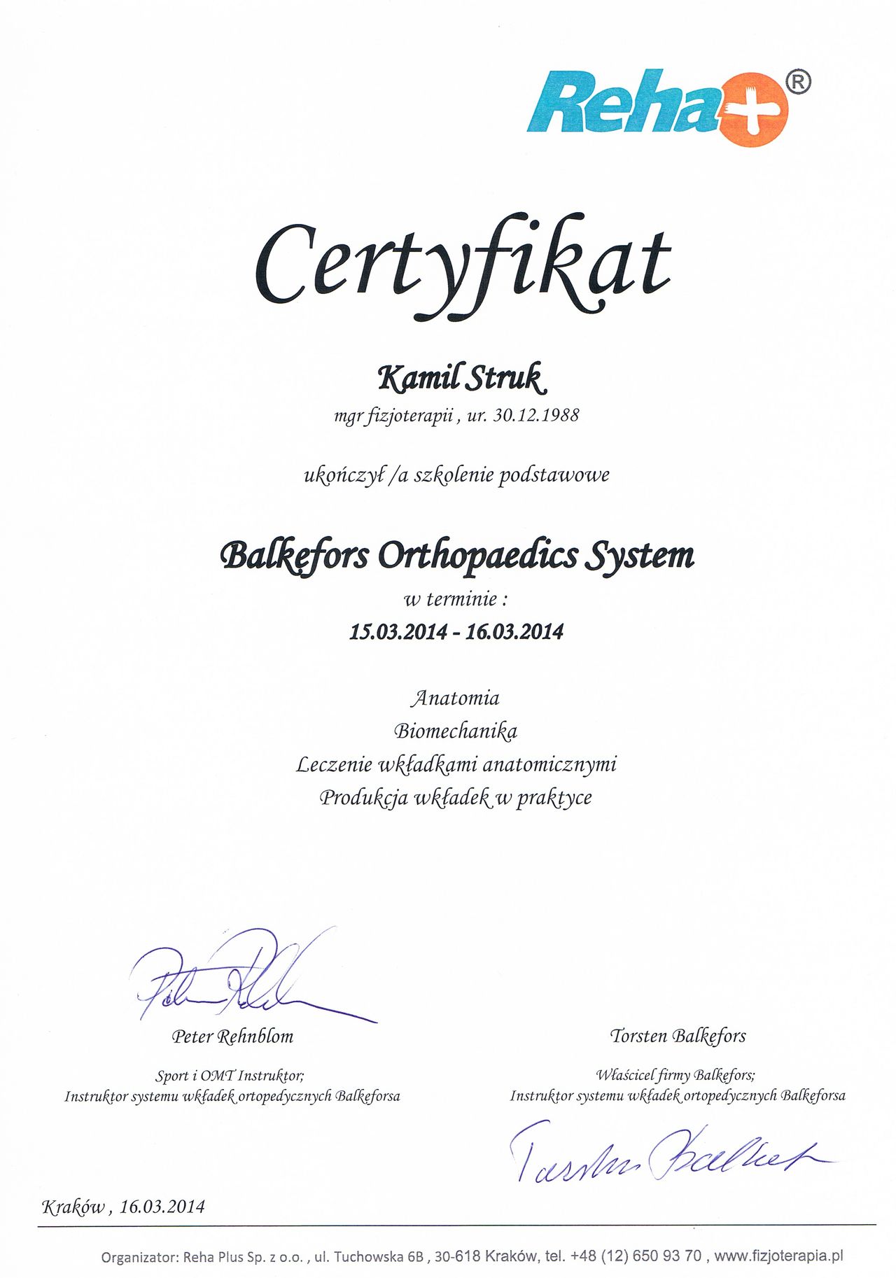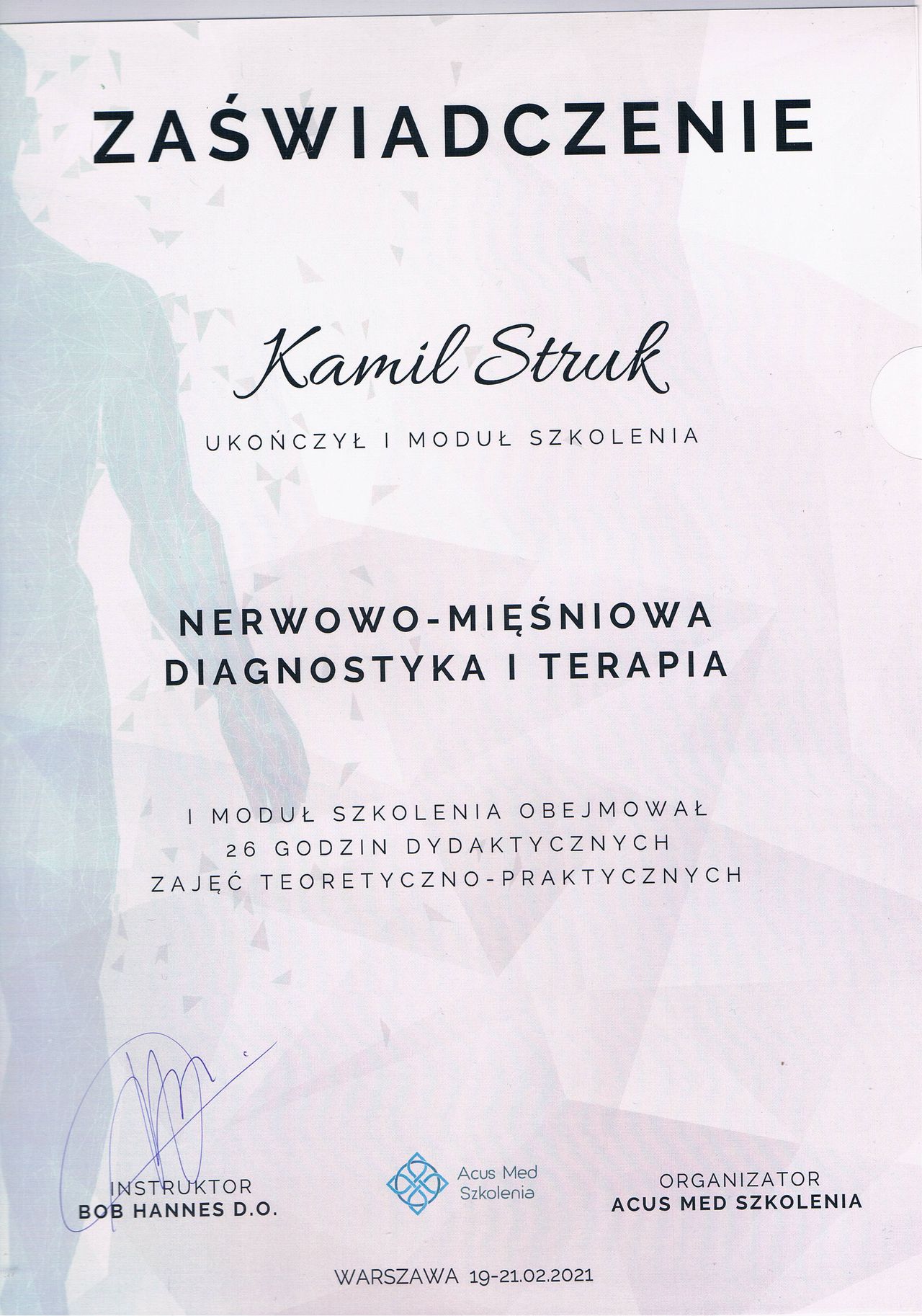 Dyplomowany terapeuta metody PNF (Proprioceptiv Neuromuscular Facilitation).