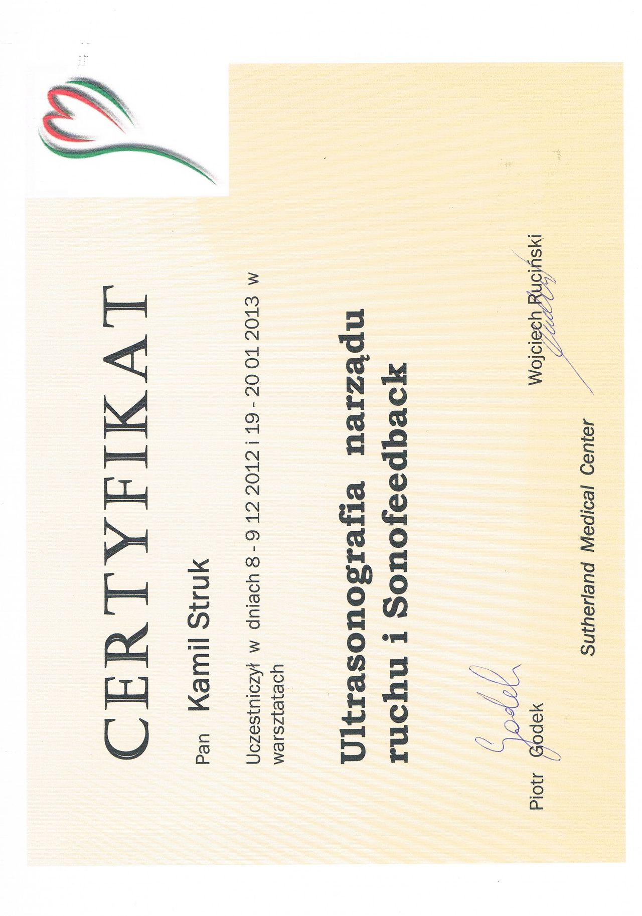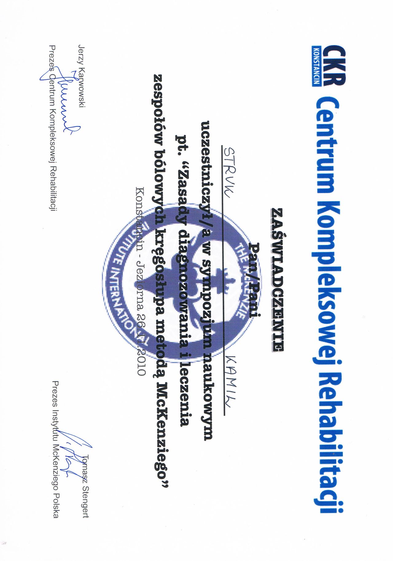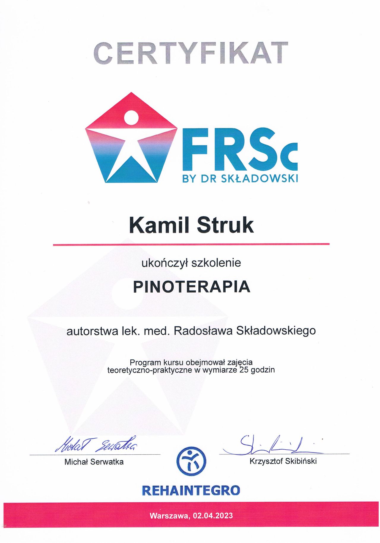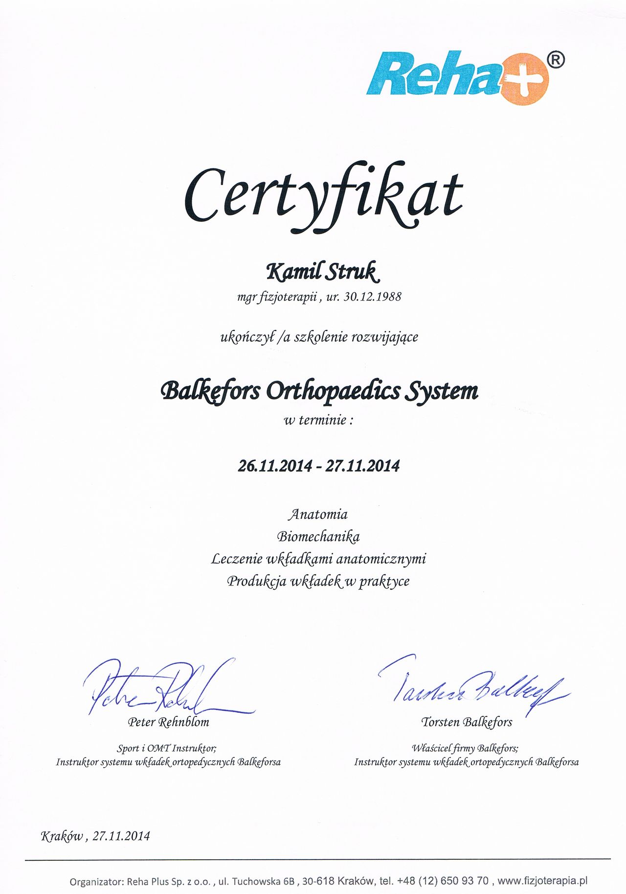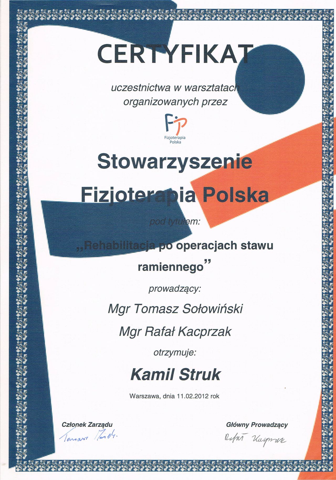 Dyplomowany terapeuta metody PNF (Proprioceptiv Neuromuscular Facilitation).