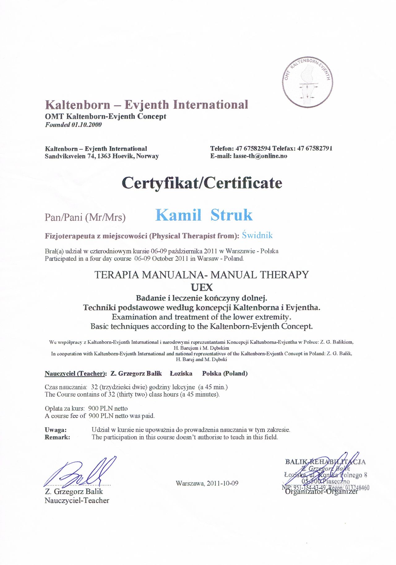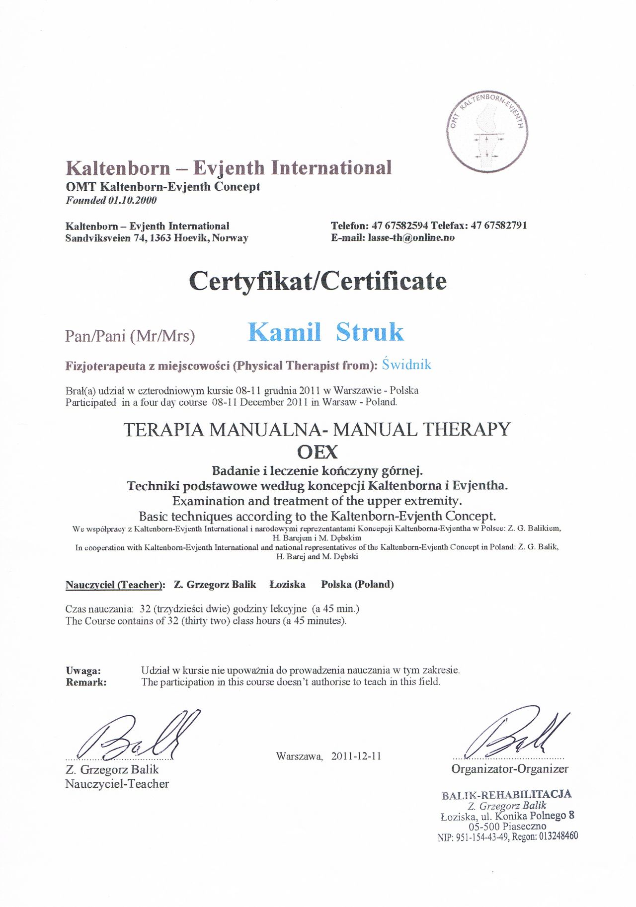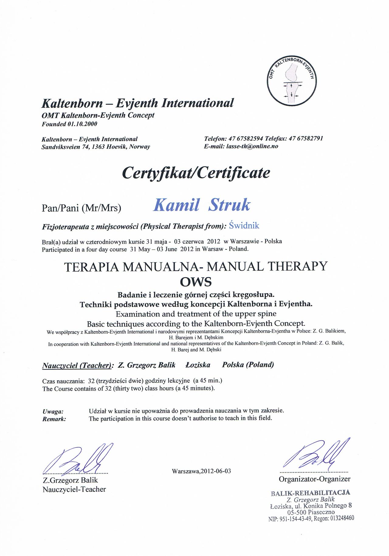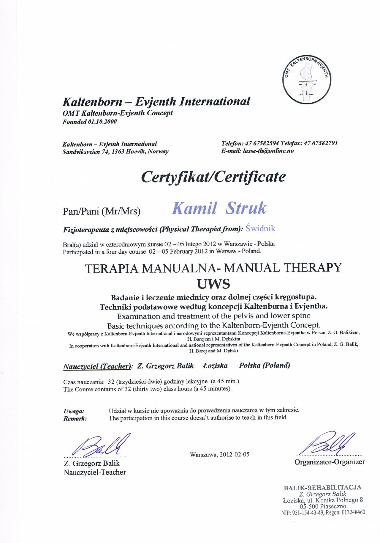 Terapeuta manualny metody Kaltenborn-Evienth Koncept oraz HVLA (Manipulacje Krótkodźwigniowe)