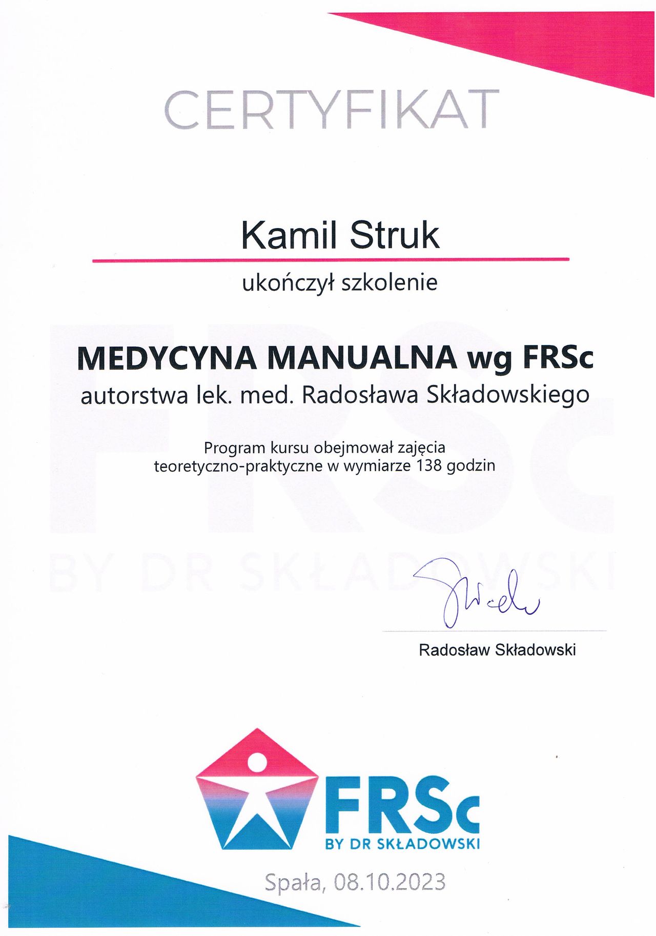 Terapeuta manualny metody FRSc (Five Regulatory Systems concept)