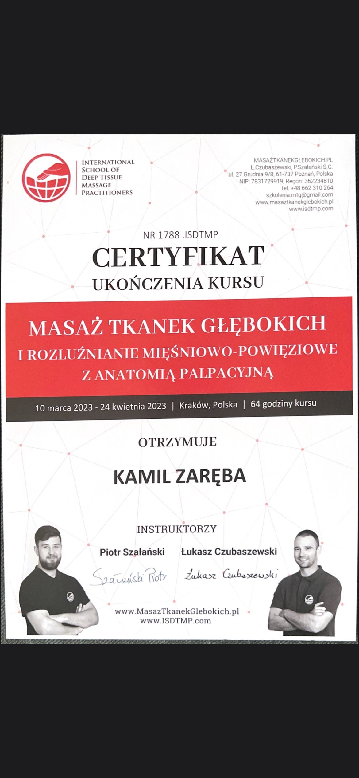 Trafiłem do Pana Kamila z zaostrzoną dyskopatią w odcinku lędźwiowym. Pomimo pesymistycznych opinii ortopedów dzięki pracy z p.Kamilem powoli wracam do zdrowia i po wielu miesiącach mogę sam zawiązać sobie buty. Profesjonalizm, doświadczenie i indywidualne podejście do pacjenta sprawiają że szczerze mogę polecić współpracę z Panem Kamilem.