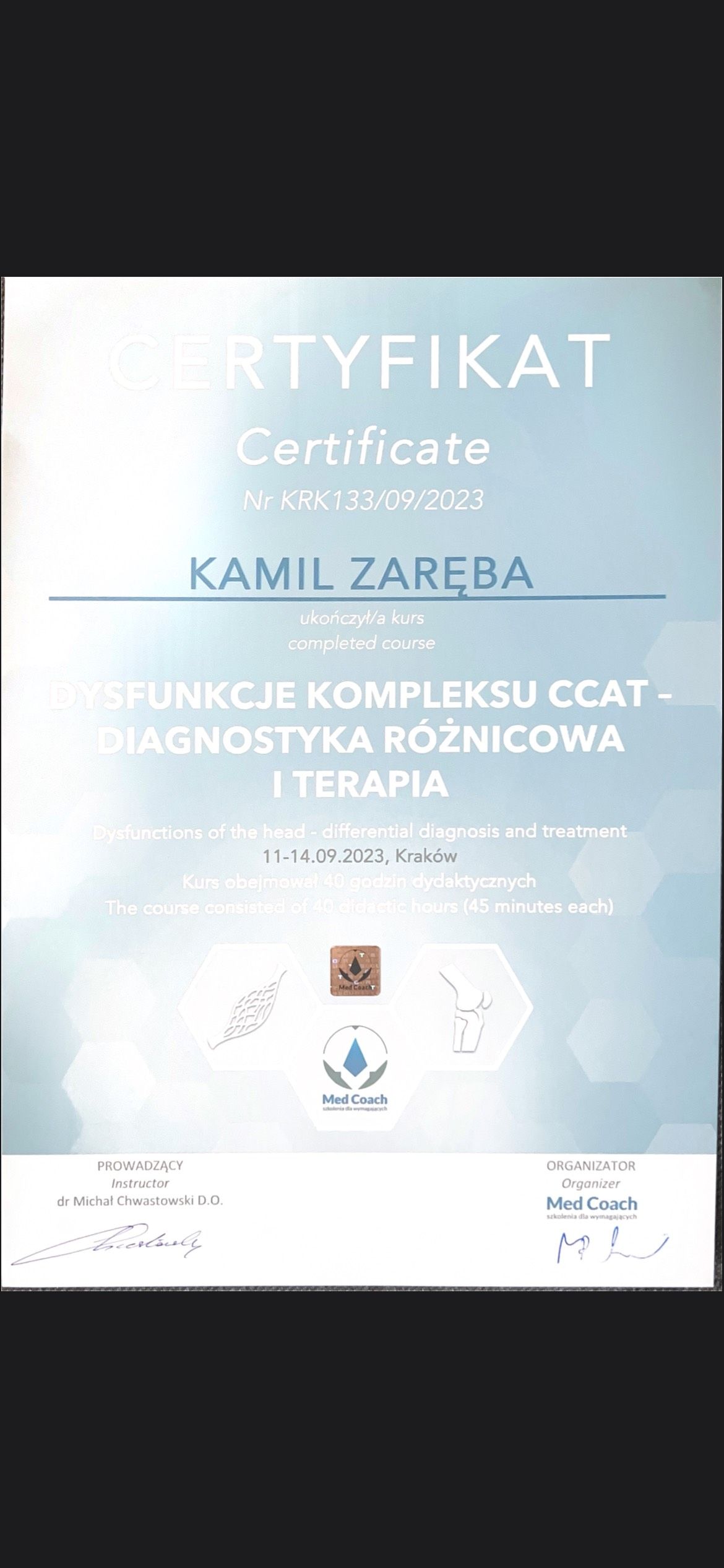 Jestem bardzo zadowolona z wizyty u Pana Kamila. Ogromna wiedza i indywidualne podejście bardzo mi pomogły, poczułam dużą poprawę i dostałam zestaw ćwiczeń do utrzymania efektów. Polecam