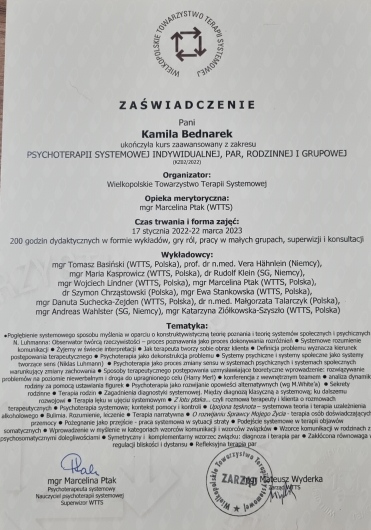 Jestem członkinią nadzwyczajną Wielkopolskiego Towarzystwa Terapii Systemowej. Pracuję pod superwizją i stale rozwijam kompetencje. Doświadczenie zdobywałam w poradni psychologiczno-pedagogicznej, szkole podstawowej, przedszkolach oraz podczas prowadzenia warsztatów, szkoleń i wykładów.