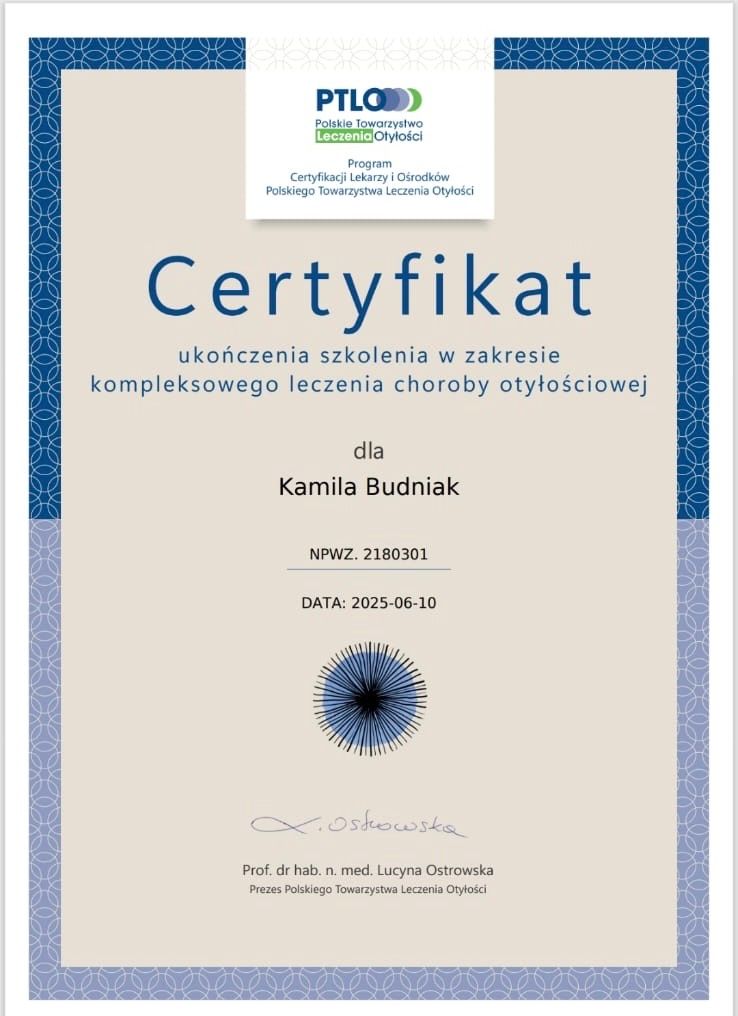 Pani doktor posiada dyplom kompleksowego leczenia choroby otyłościowej.