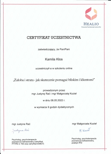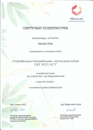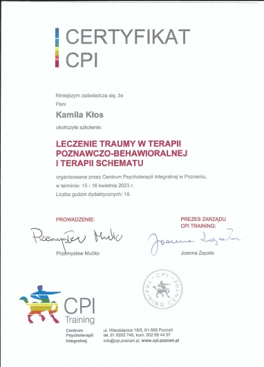 Uczęszczam na terapie do Pani Kamili od niecałych 4 miesięcy, jestem już w całkiem innym miejscu niż przedtem. Pani Kamila jest empatyczna i zaangażowana, pomaga zobaczyć swój problem z innej perspektywy. Bardzo polecam każdemu kto czuje, że potrzebuje pomocy.
