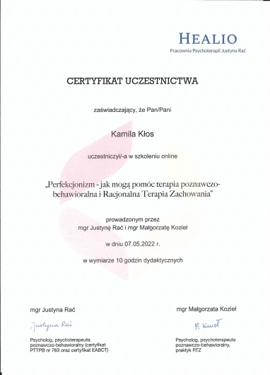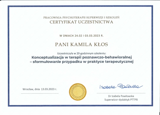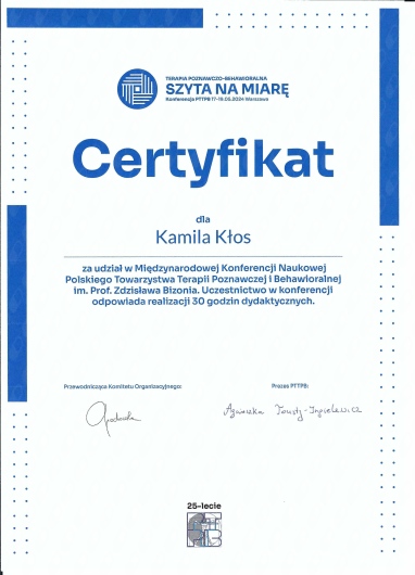 Mój proces terapeutyczny u Pani Kamili trwał prawie 2 lata. Stopniowo widziałam, jak moje samopoczucie powoli się poprawia dzięki rozpracowywaniu niefunkcjonalnych przyzwyczajeń i przekonań. Pani Kamila niezwykle celnie diagnozuje problemy i potrafi zaproponować dla nich rozwiązanie, które rzeczywiście pomaga. Terapia wyciągnęła mnie ze sporego dołku i pokazała, że nie muszę być stale zestresowana i nieszczęśliwa. Najlepszą rekomendacją będzie podsumowanie, że dzięki pomocy Pani Kamili i naszej wspólnej systematycznej pracy - pierwszy raz w życiu mogę otwarcie przyznać, że jestem w pełni szczęśliwa :) Bardzo Pani dziękuję
