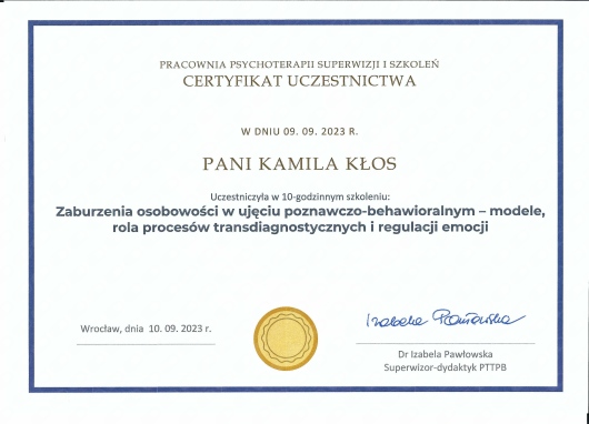 Ukończyłam psychologię w Szkole Wyższej Psychologii Społecznej oraz Studia Podyplomowe z Przygotowania Pedagogicznego i Terapii Zajęciowej w Dolnośląskiej Szkole Wyższej. Aktualnie w trakcie Szkoły Psychoterapii Poznawczo – Behawioralnej Uniwersytetu SWPS. Swoją wiedzę sukcesywnie rozwijam podczas licznych szkoleń i konferencji. Doświadczenie zawodowe zdobywałam w Wojewódzkim Centrum Psychiatrii Długoterminowej w Stroniu Śląskim, Dolnośląskim Centrum Zdrowia Psychicznego w ramach Oddziału Dziennego Psychiatrycznego, w Poradni Psychologiczno – Pedagogicznej oraz Zakładzie Opiekuńczo – Leczniczym.
