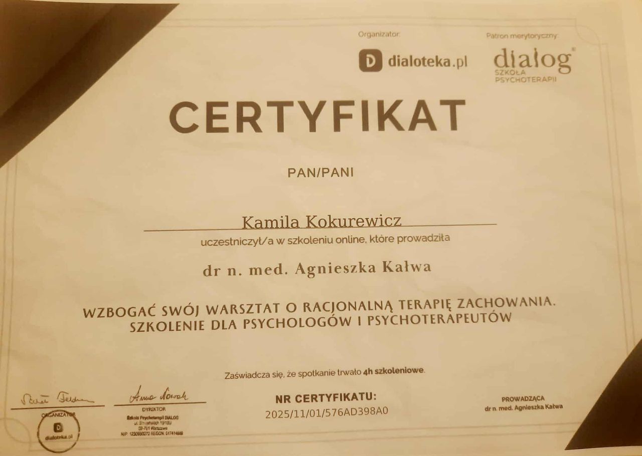Bardzo polecam współpracę z Panią Kamilą. Jestem jej ogromnie wdzięczna za to, że zawsze uważnie mnie wysłuchiwała i potrafiła pokazać zupełnie inny punkt widzenia na wiele spraw. Dzięki naszym rozmowom nauczyłam się łapać dystans, mniej emocjonalnie podchodzić do trudnych sytuacji i lepiej rozumieć własne reakcje.