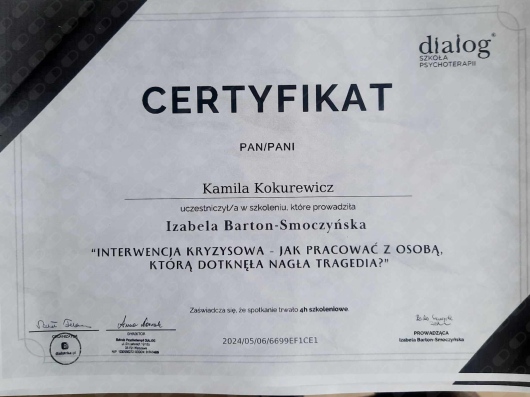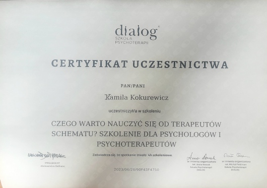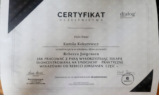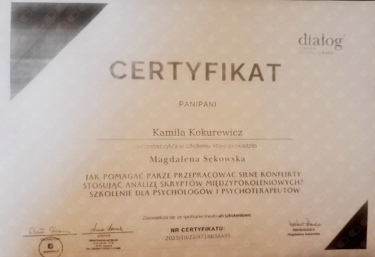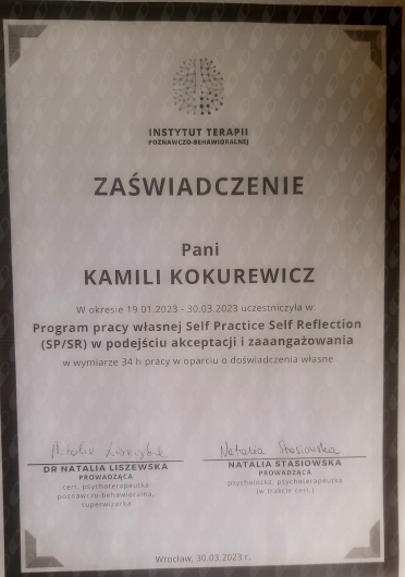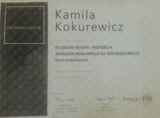 Dzień dobry! Nazywam się Kamila Kokurewicz i jestem psychologiem o specjalności klinicznej. Dyplom uzyskałam na Uniwersytecie Humanistycznospołecznym SWPS we Wrocławiu. Ukończyłam również studium Terapii Skoncentrowanej na Rozwiązaniach (TSR) w ośrodku akredytowanym przez Polskie Stowarzyszenie Terapeutów Terapii Skoncentrowanej na Rozwiązaniach (PSTTSR), którego jestem członkiem. Zgodnie z tym nurtem postrzegam swoich pacjentów jako osoby zdolne do zmian m.in. dzięki ich własnym zasobom, które pomagam odkryć, nazwać i wykorzystać do realizacji ich celu. Poznałam również "od poszewki"{ koncepcję podejścia Akceptacji i Zaangażowania (ACT), które skupia się na wartościach klienta i pracý, by żył on jak najpełniej- pomimo doswiadczania nieprzyjemnych uczuć I myśli. Kolejnym moim wyzwaniem są studia na kierunku Seksuologia Kliniczna, które rozpoczęłam na Uniwersytecie Humanistyczno Społecznym SWPS we Wrocławiu.Swoje doświadczenie zawodowe zdobywałam podczas praktyki studenckiej pod kierunkiem psychologów, a także jako wolontariuszka na Oddziale Psychiatrycznym Dzieci i Młodzieży we Wrocławiu oraz w Dziennym Ośrodku Psychiatrii i Zaburzeń Mowy dla Dzieci i Młodzieży we Wrocławiu przy ul. Wołowskiej, gdzie uczestniczyłam w procesie diagnozy, udzielałam rozmów wsparciowych oraz organizowałam warsztaty rozwojowe. W pracy wykorzystuję elementy terapii poznawczo – behawioralnej, której głównym założeniem jest przekonanie, że myśli, emocje i zachowania człowieka wzajemnie na siebie wpływają, tworząc wzorce zachowań, które nie zawsze są właściwe, terapii skoncentrowanej na rozwiązaniach – bazującej na zasobach pacjenta, terapii akceptacji i zaangażowania (ACT) oraz psychoedukacji. Metody i techniki terapeutyczne dobieram indywidualnie. W kontakcie z pacjentem ważny jest dla mnie przede wszystkim szacunek i akceptacja dla jego osobistego i niepowtarzalnego świata wewnętrznego, zrozumienie i życzliwość, a także respektowanie zasad etyki zawodu psychologa – w szczególności zasady poufności i prywatności. Do obszaru moich zawodowych zainteresowań należą głównie:
