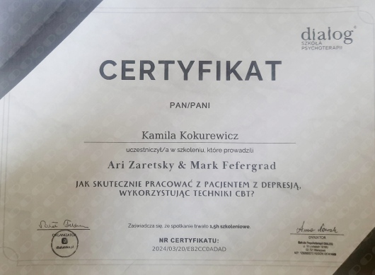 Z całego serca polecam Panią Kamilę. Kilka lat temu miałam doświadczenie z innym psychologiem, które niestety zraziło mnie do terapii. Gdy trafiłam na Panią Kamilę, wszystko się zmieniło. Dzięki niej z przyjemnością uczestniczę w spotkaniach terapeutycznych. Panuje tam przyjazna i naturalna atmosfera, w której czuję się naprawdę komfortowo. Jej wsparcie i rady są dla mnie bardzo skuteczne, a już teraz widzę ogromną, pozytywną zmianę w swoim życiu. Serdecznie polecam każdemu, kto szuka profesjonalnej i empatycznej pomocy.