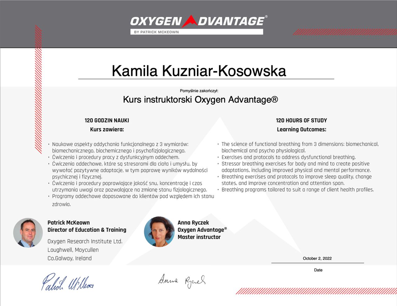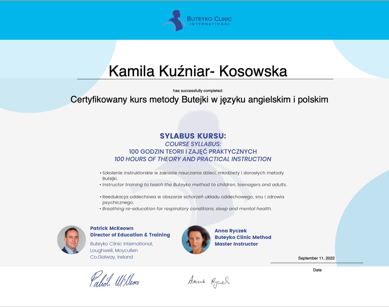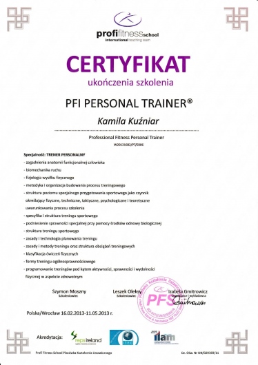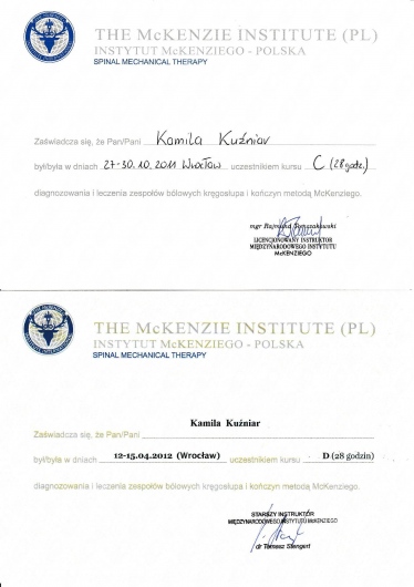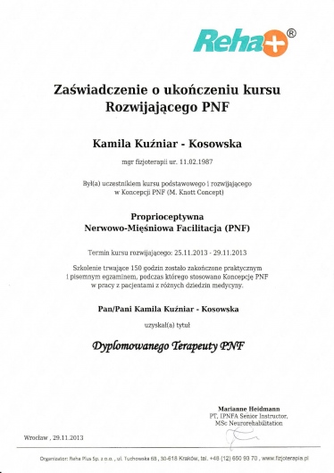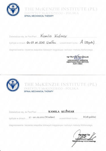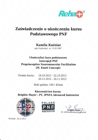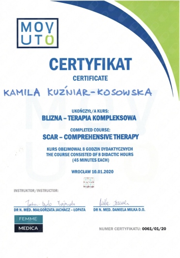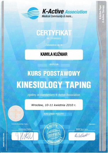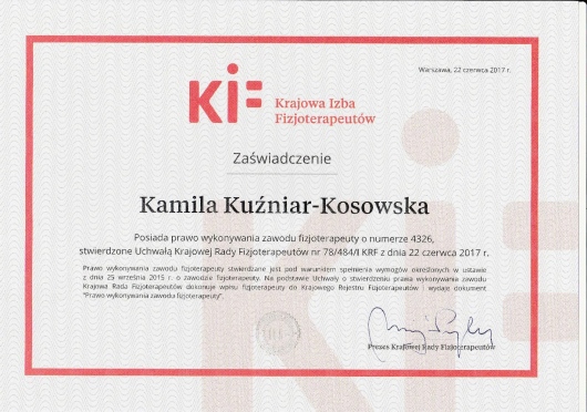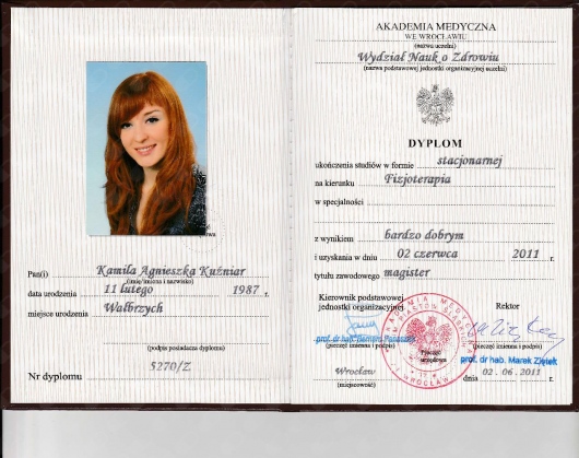 Jestem absolwentką Akademii Medycznej im. Piastów Śląskich we Wrocławiu. Ukończyłam tę uczelnię uzyskując tytuł magistra fizjoterapii oraz odznaczenie „Wzorowy Student”, nagrodę Rektora uczelni o nr legitymacji 1414.