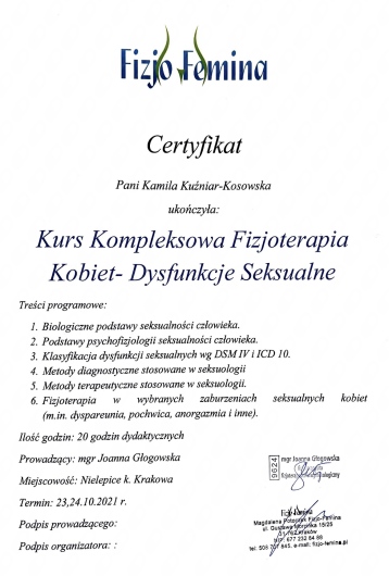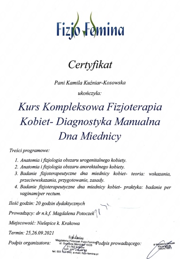 Byłam u Pani Kamili na kilku wizytach, podczas których skutecznie rozluźniła moje napięte mięśnie dna miednicy. Pokazała również, jak je ćwiczyć i rozluźniać samodzielnie. Profesjonalne i spokojne podejście. Polecam