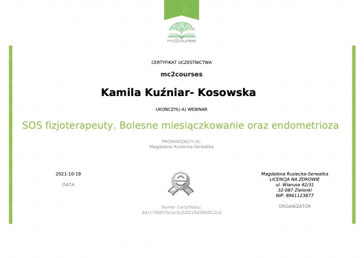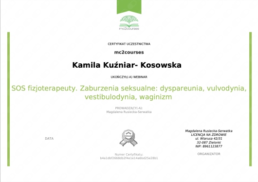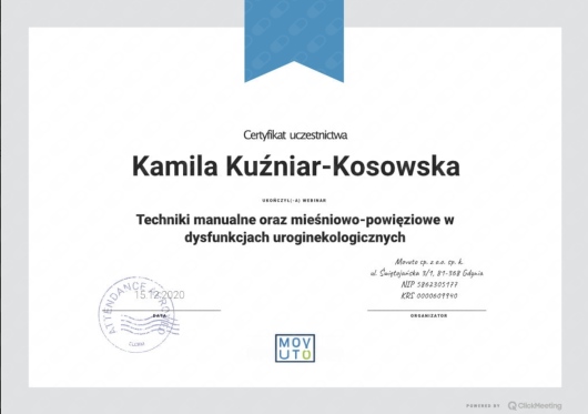 Jaki jest zakres porad oferowanych przez Kamila Kuźniar-Kosowska?Kamila Kuźniar-Kosowska to fizjoterapeuta. Na podstawie swojego doświadczenia i wykształcenia Kamila Kuźniar-Kosowska oferuje usługi takie jak: fizjoterapia uroginekologiczna - bóle miesiączkowe i endometrioza, fizjoterapia uroginekologiczna - dysfunkcje seksualne, fizjoterapia kobiet w ciąży / fizjoterapia okołoporodowa, terapia kręgosłupa, rehabilitacja oddechowa, masaż kobiet w ciąży, masaż relaksacyjny, fizjoterapia, masaż, masaż klasyczny.