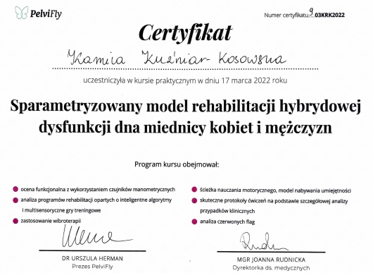 Jestem również PelviCouchem sparametryzowanego modelu rehabilitacji hybrydowej dysfunkcji dna miednicy PelviFly. Wykorzystuję w terapii nowoczesne sondy do pomiarowania siły i funkcji mięśni dna miednicy oraz ich rehabilitacji i treningu.