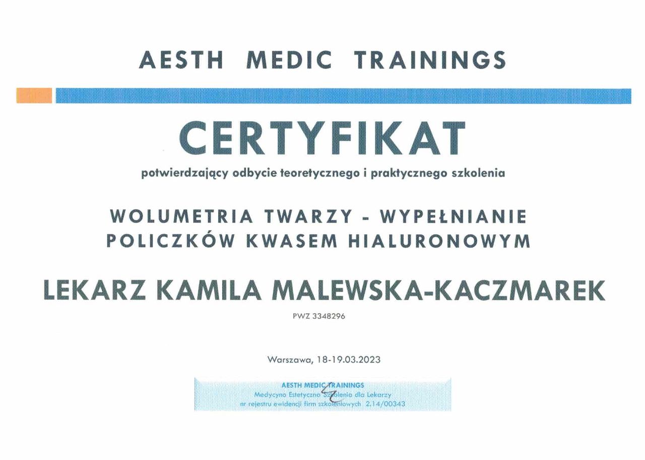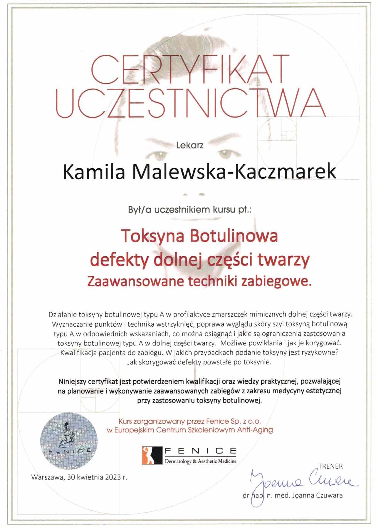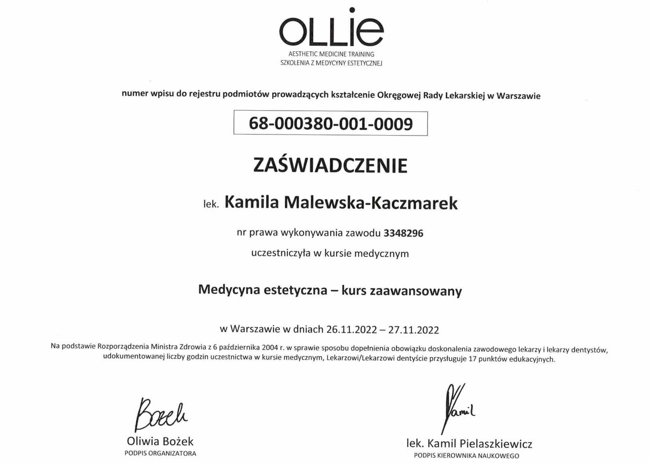 Nazywam się dr Kamila Malewska-Kaczmarek i jestem lekarzem specjalizującym się w medycynie estetycznej. Ukończyłam studia na Wydziale Lekarskim Uniwersytetu Medycznego w Łodzi w 2016 roku. W 2024 roku uzyskałam stopień doktora nauk medycznych oraz doktora nauk o zdrowiu.