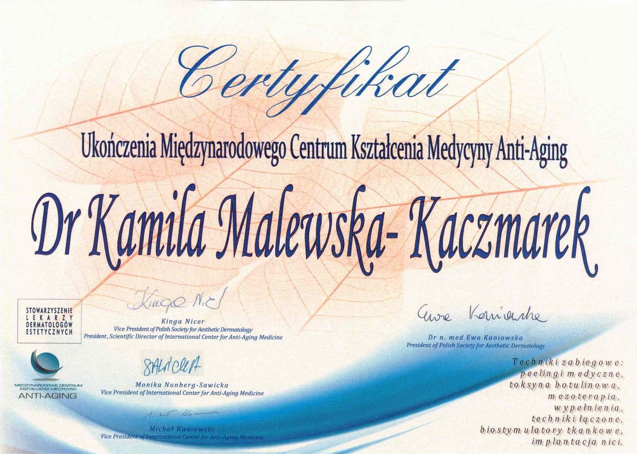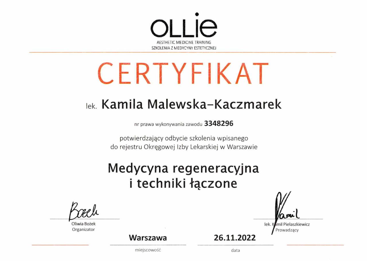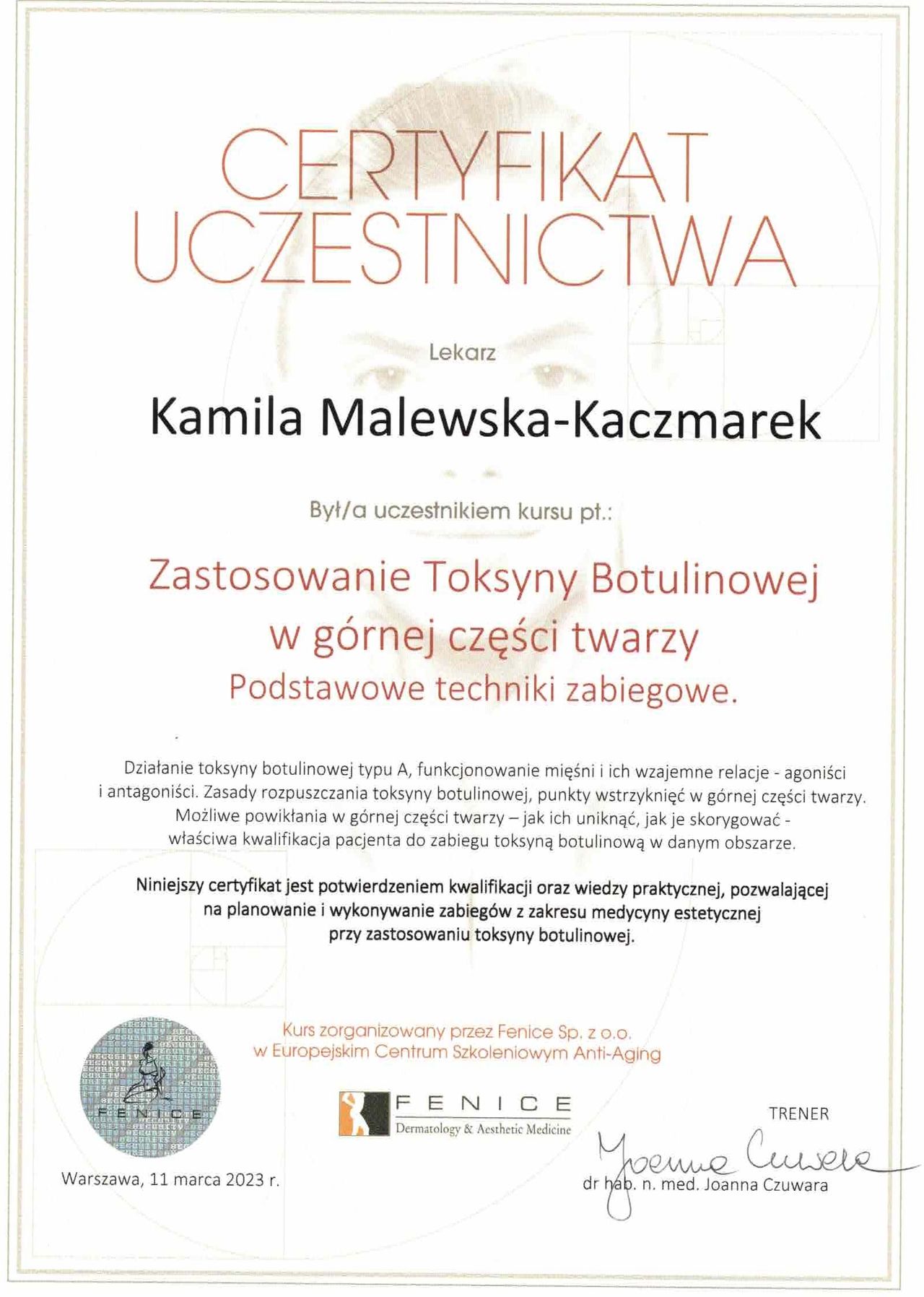 Nazywam się dr Kamila Malewska-Kaczmarek i jestem lekarzem specjalizującym się w medycynie estetycznej. Ukończyłam studia na Wydziale Lekarskim Uniwersytetu Medycznego w Łodzi w 2016 roku. W 2024 roku uzyskałam stopień doktora nauk medycznych oraz doktora nauk o zdrowiu.