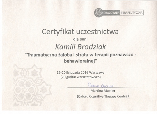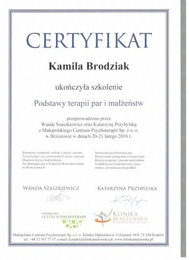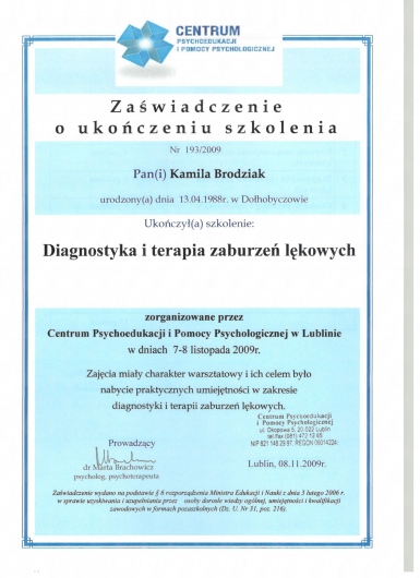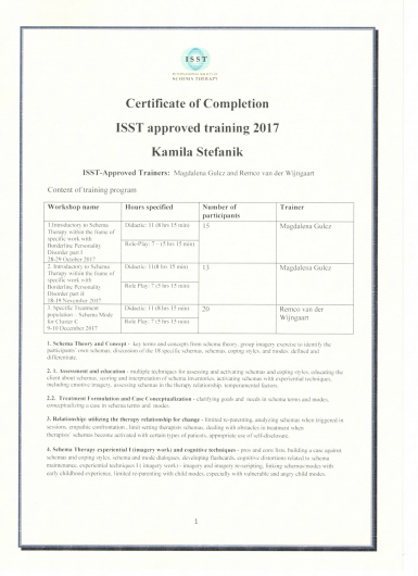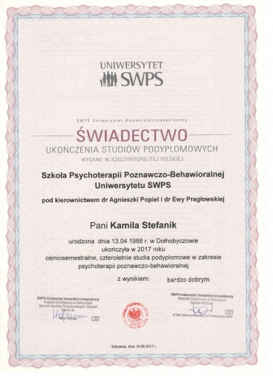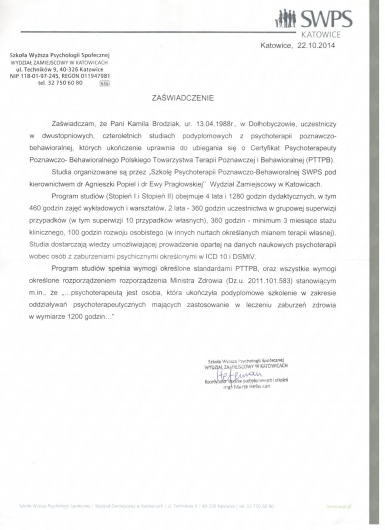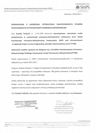 Zapraszam Psycholog, Certyfikowany Psychoterapeuta poznawczo-behawioralny (nr 555) w Polskim Towarzystwie Terapii Poznawczo-Behawioralnej zgodnie ze standardami European Association for Behavioural and Cognitive Therapies, członek Stowarzyszenia Psychologów Sądowych w Krakowie; Terapeuta Terapii Schematów w trakcie certyfikacji.