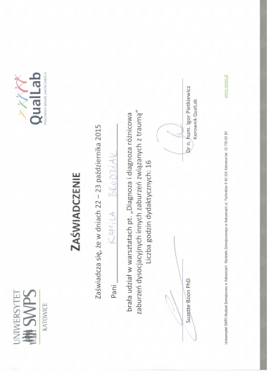 22.10 - 23.10.2015 Diagnoza i diagnoza różnicowa zaburzeń dysocjacyjnych innych zaburzeń związanych z traumą (Katowice)