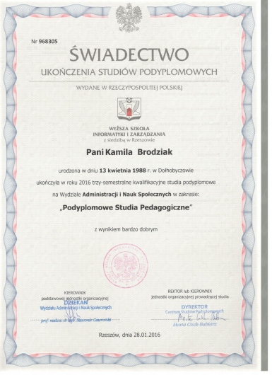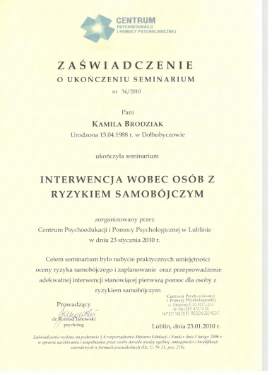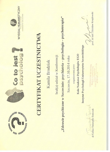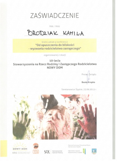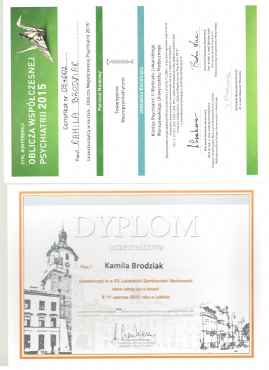 Jestem osobą ambitną, która stale podnosi swoją wiedzę, kompetencje i umiejętności poprzez udział w szkoleniach i konferencjach. Między innymi: