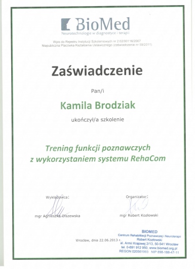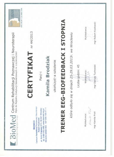 2013r. Trener EEG-BIOFEEDBACK I stopnia (40 godz. Wrocław)