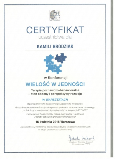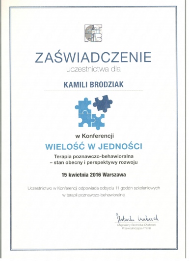 14.04 - 16.04.2016 Wielość w jedność. Terapia poznawczo-behawioralna- stan obecny i perspektywy rozwoju, (Warszawa) Udział w Warsztatach: