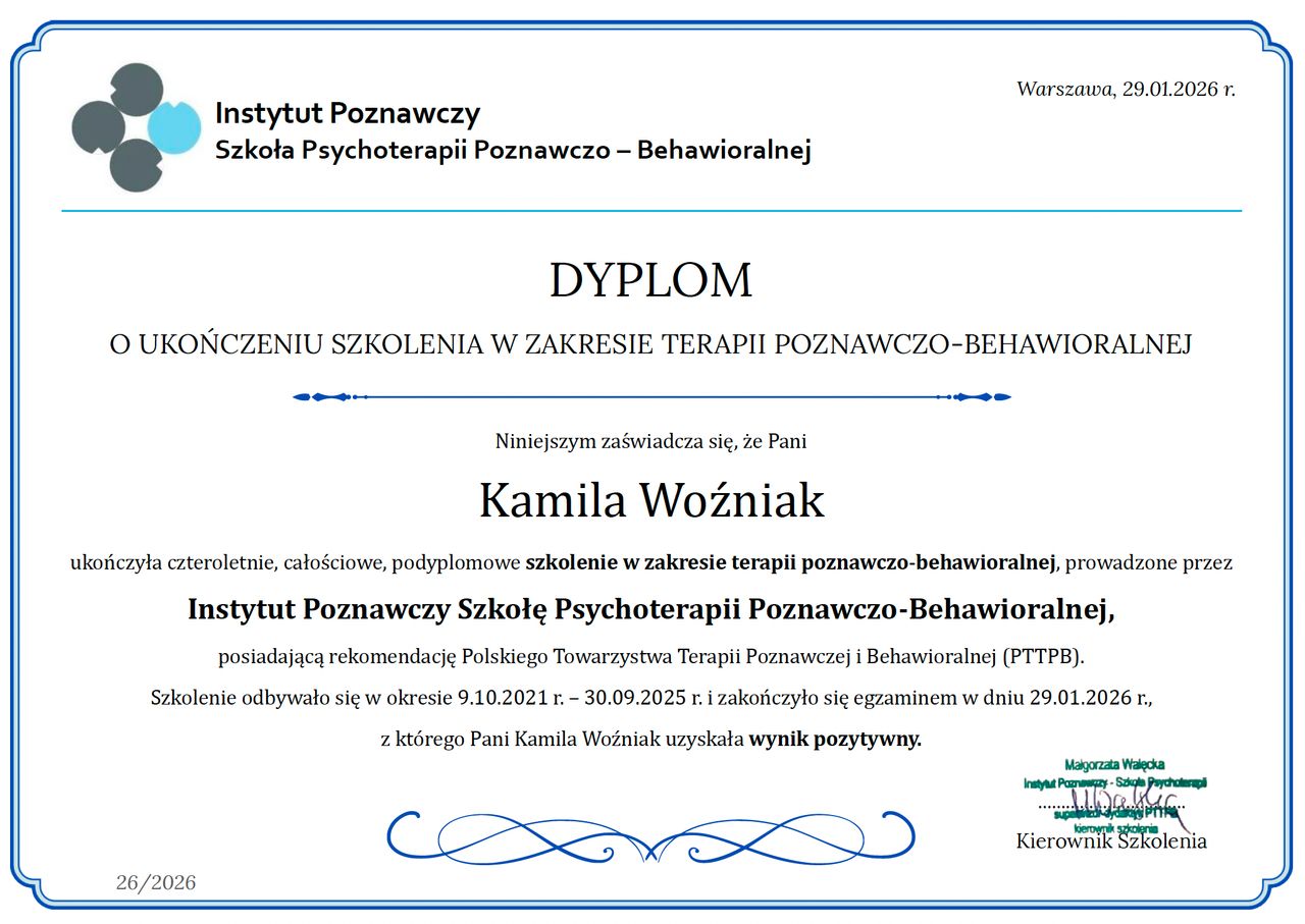 jestem psycholożką oraz certyfikowaną psychoterapeutką poznawczo-behawioralną (certyfikat PTTPB nr 2412).