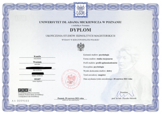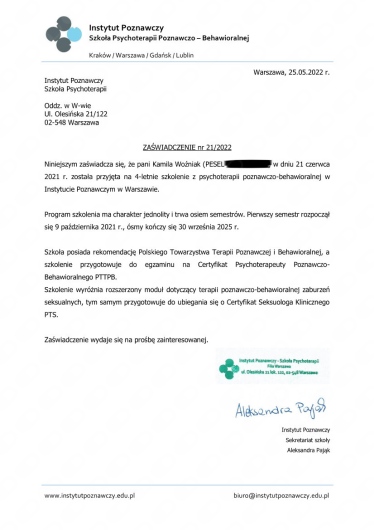 Psychologię ukończyłam na Uniwersytecie im. Adama Mickiewicza w Poznaniu (specjalności: psychoterapia zaburzeń psychicznych, seksuologia kliniczna), natomiast 4-letnie szkolenie psychoterapeutyczne ukończyłam w Instytucie Poznawczym w Warszawie, szkole akredytowanej przez Polskie Towarzystwo Terapii Poznawczo-Behawioralnej.