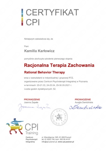 To była moja pierwsza sesja z Panią Kamilą i już wiem, że nie ostatnia. Pani Kamila jest bardzo profesjonalna i konkretna w działaniu a przy tym ogromnie empatyczna dając poczucie bezpieczeństwa i 100% wysłuchania. Polecam z całego serca.